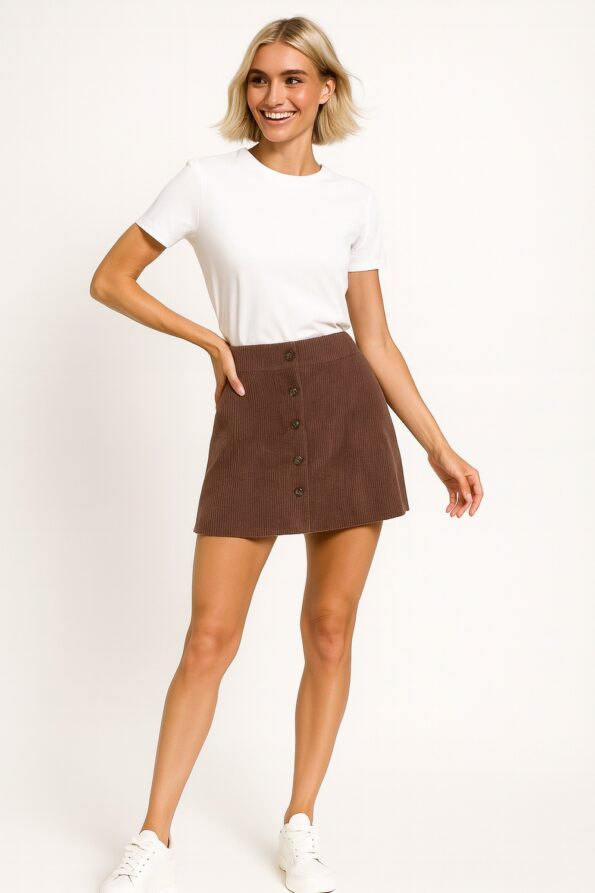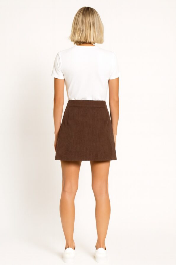Falda corta confeccionada en tela de textura acanalada que aporta un acabado distintivo y moderno, diseño con botonadura frontal funcional que realza el estilo clásico y versátil, pretina ancha que brinda soporte y ajuste seguro en la cintura, bolsillos laterales prácticos que ofrecen comodidad y funcionalidad, dobladillo recto que mantiene la forma estructurada de la prenda y asegura resistencia en el uso continuo