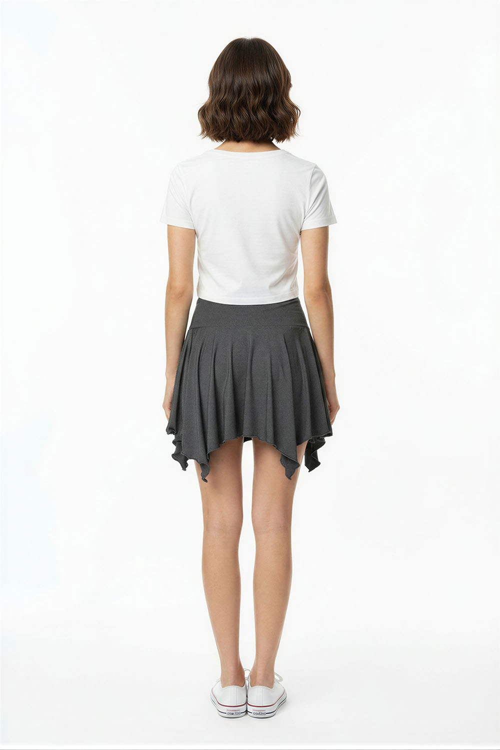 Falda corta con pretina ancha que brinda ajuste seguro en cintura, diseño de corte asimétrico que aporta movimiento, confección fluida que permite caída ligera, estructura amplia que facilita comodidad al caminar, acabado limpio que mantiene forma y volumen