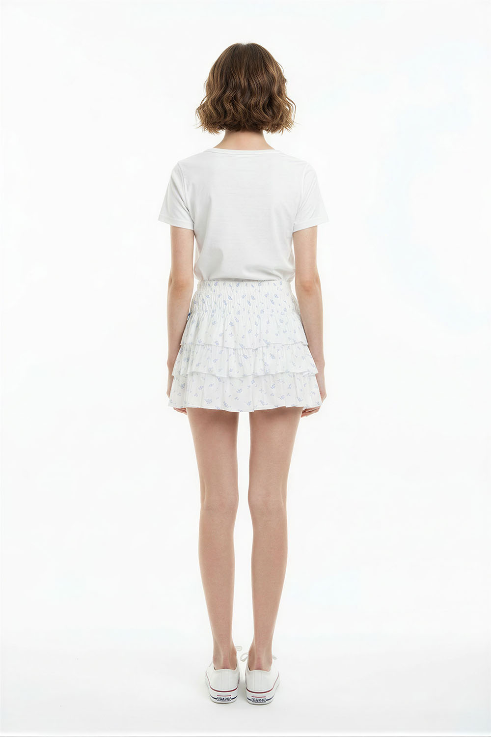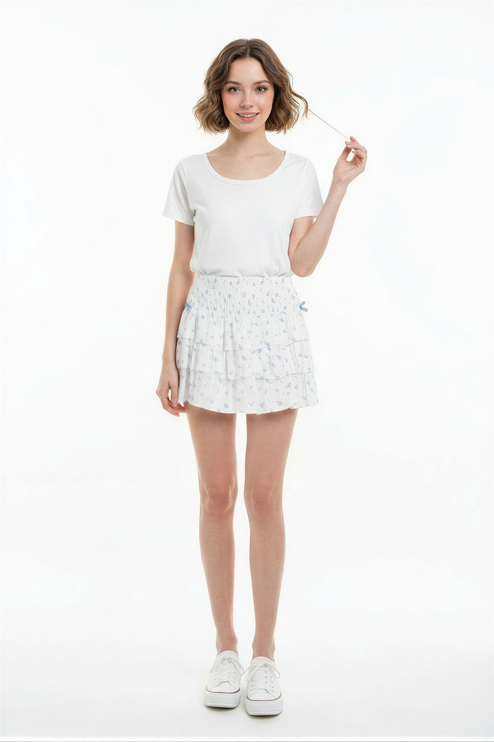 Minifalda con pretina elástica, ajuste flexible a la cintura, diseño con doble olan, silueta ligera, caída fluida, confección cómoda para uso diario