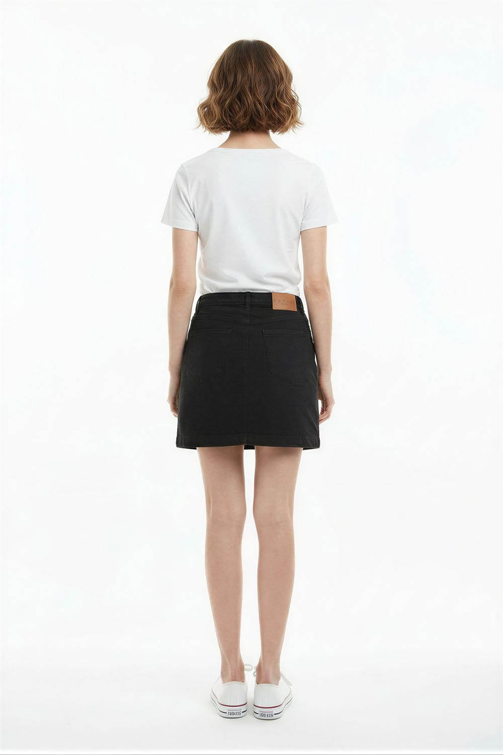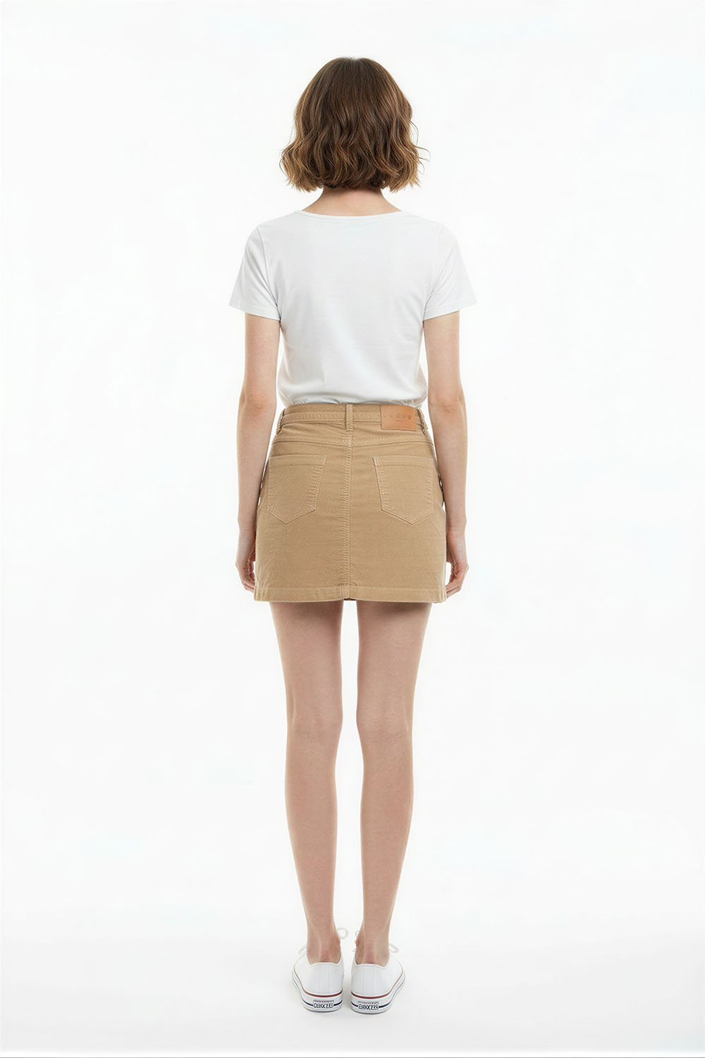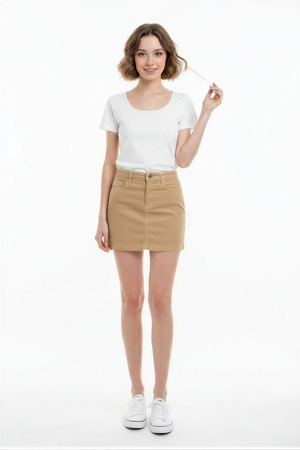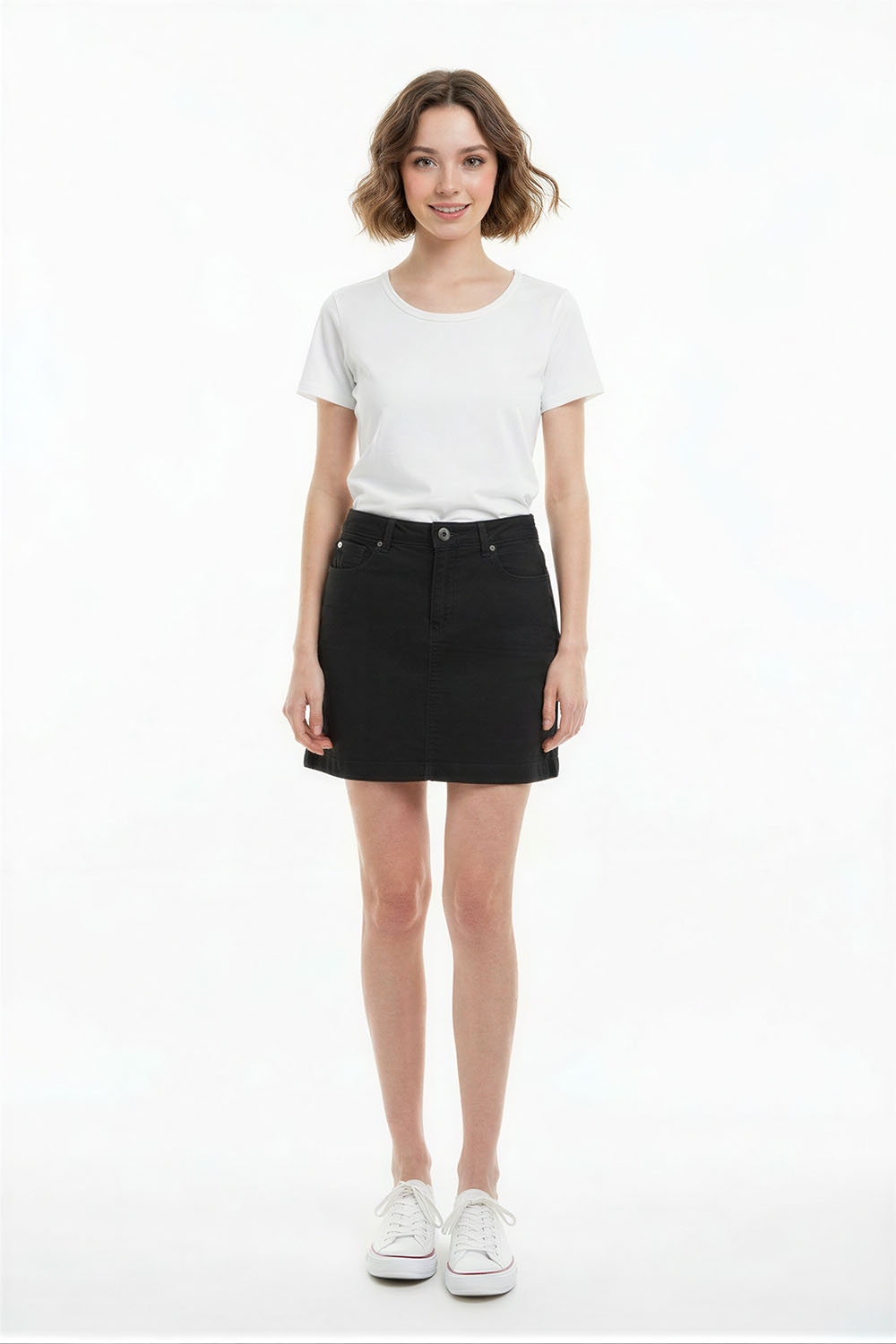 Falda corta con ajuste recto, pretina definida, estructura firme, confección cómoda, acabado limpio que se adapta al cuerpo