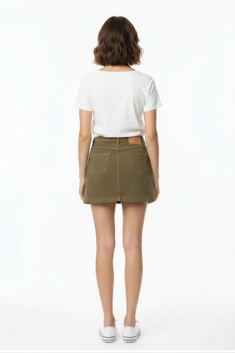 Falda corta de tiro alto con pretina estructurada que brinda ajuste firme, diseño con cinco bolsas funcionales que aportan practicidad, corte recto que define la silueta, cierre frontal con botón y cremallera que facilita el uso, confección en tejido resistente con acabado firme que mantiene su forma