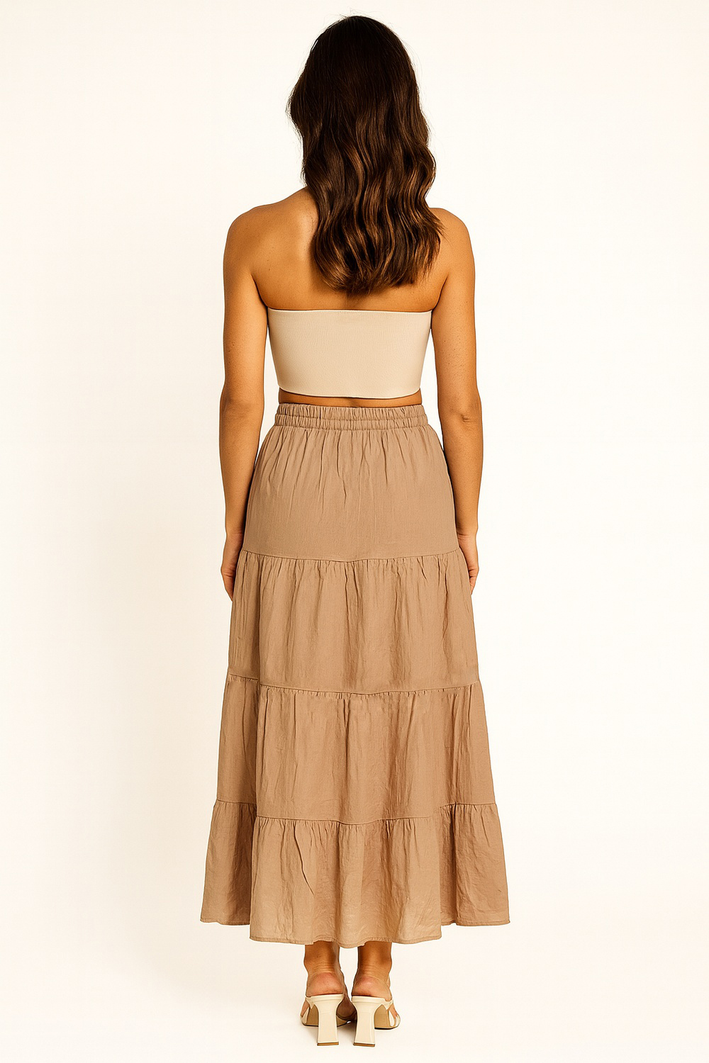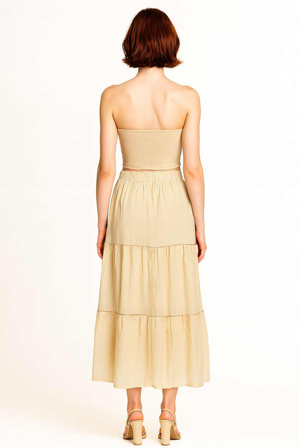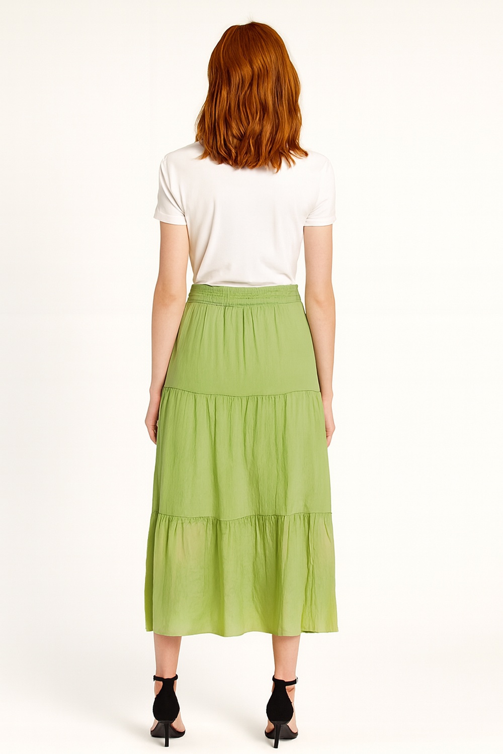 Falda de largo midi con diseño en gajos que aporta volumen equilibrado, pretina elástica que brinda ajuste cómodo a la cintura, confección en tejido ligero con caída fluida, estructura escalonada que añade movimiento, terminación amplia en el bajo