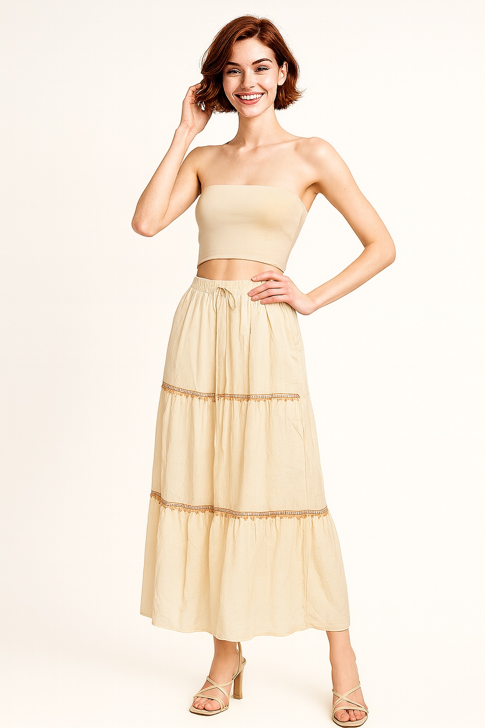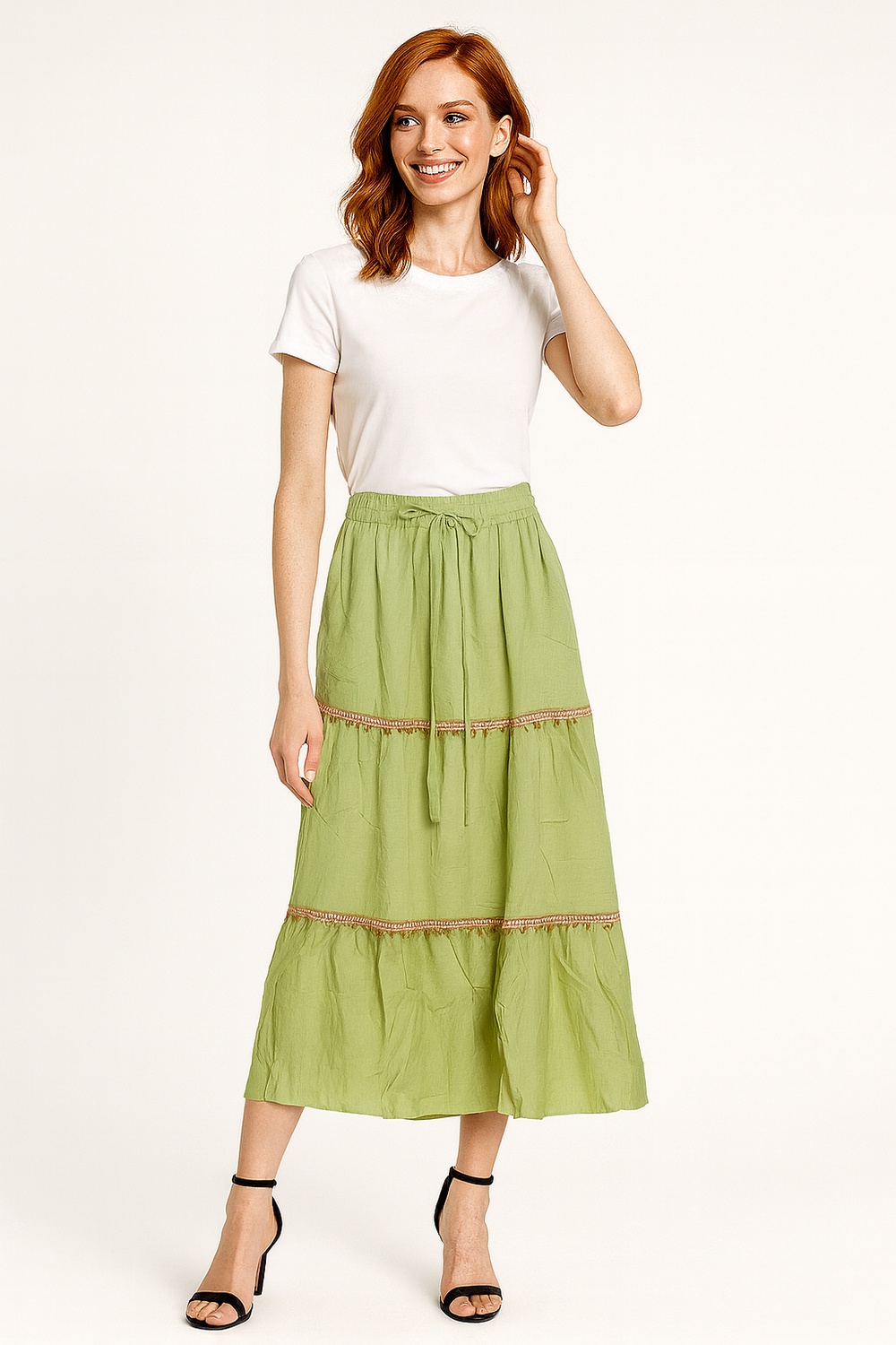 Falda larga con pretina elástica y ajuste mediante jareta, confeccionada en tejido ligero, detalle tipo crochet entre gajos que aporta textura, silueta amplia con caída fluida y movimiento natural