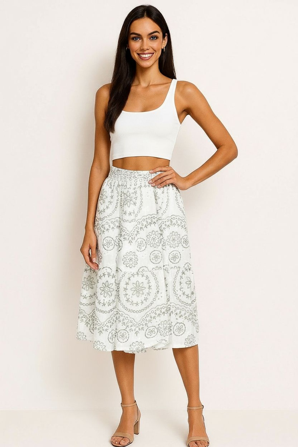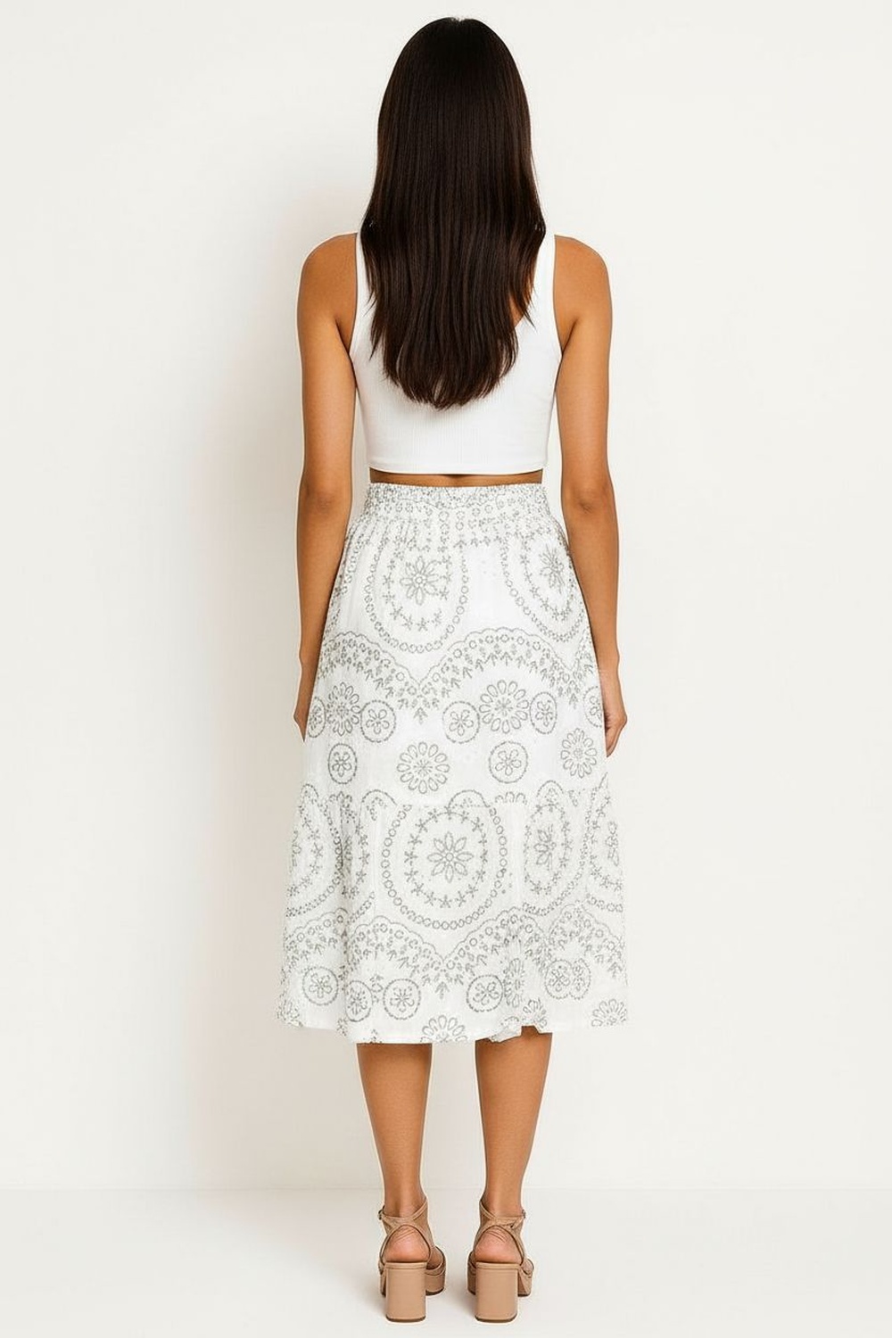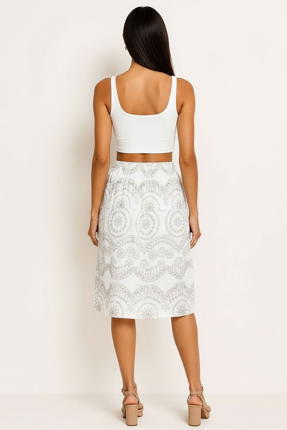 Falda midi de corte recto con caída fluida que aporta movimiento natural, pretina elástica que brinda ajuste cómodo en cintura, panel inferior con unión decorativa que añade amplitud al largo, confección ligera con forro interior que mejora la estructura y la sensación al uso, diseño pensado para uso prolongado con tacto suave y acabado prolijo