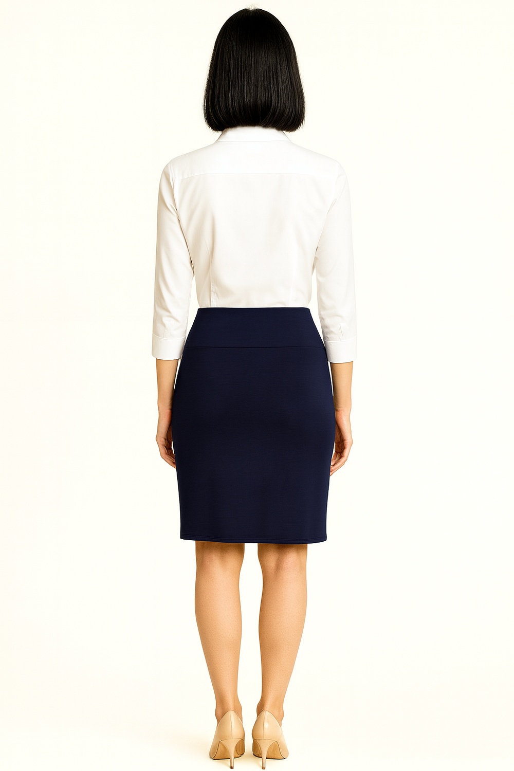 Falda tubo de corte ajustado con pretina ancha que brinda sujeción cómoda, costura trasera que estiliza la figura y aporta mejor ajuste, largo a la rodilla que ofrece un equilibrio entre elegancia y practicidad, confección en tejido firme con elasticidad ligera que se adapta al movimiento, terminaciones limpias que aseguran un acabado pulido y profesional