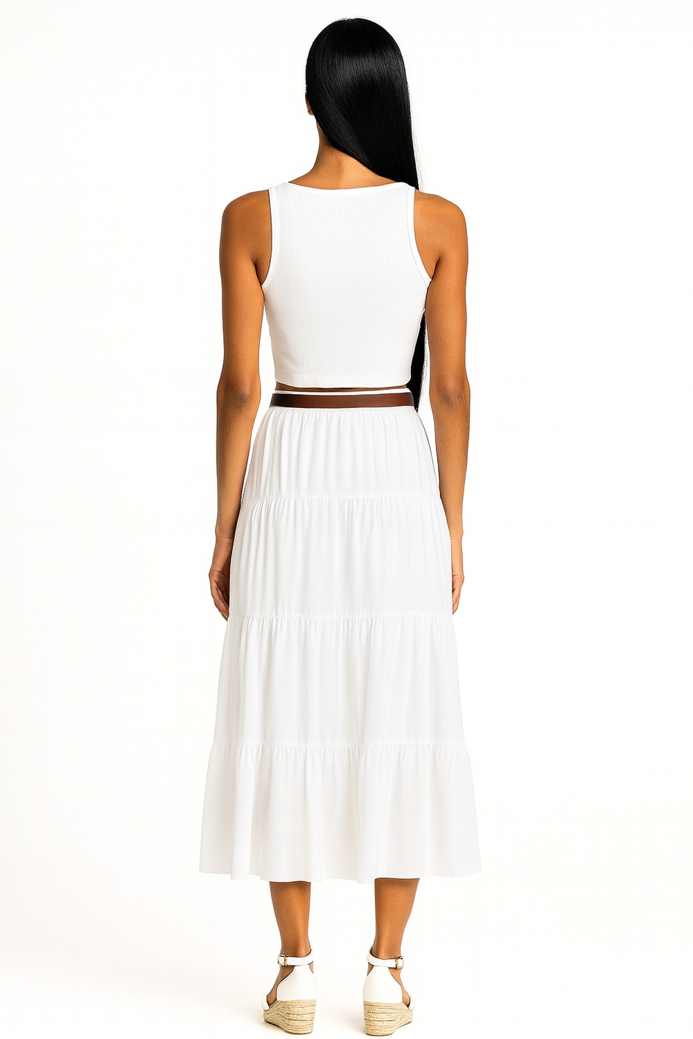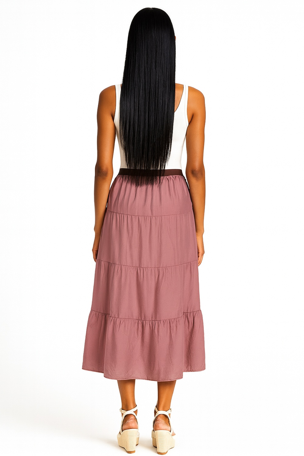 Falda larga de corte amplio con pretina cómoda y cinturón ajustable que define la cintura, diseño en bloques con olanes que generan volumen y movimiento fluido, largo midi con caída ligera que estiliza la silueta, confección fresca y suave que brinda comodidad durante todo el día