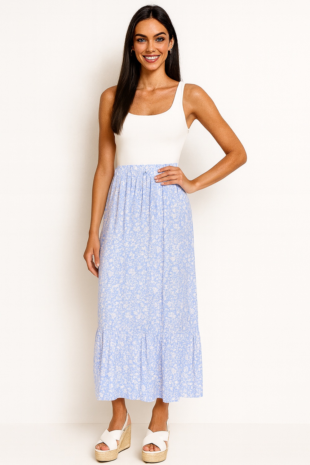 Falda larga de corte amplio con pretina cómoda y cinturón ajustable que define la cintura, diseño en bloques con olanes que generan volumen y movimiento fluido, largo midi con caída ligera que estiliza la silueta, confección fresca y suave que brinda comodidad durante todo el día
