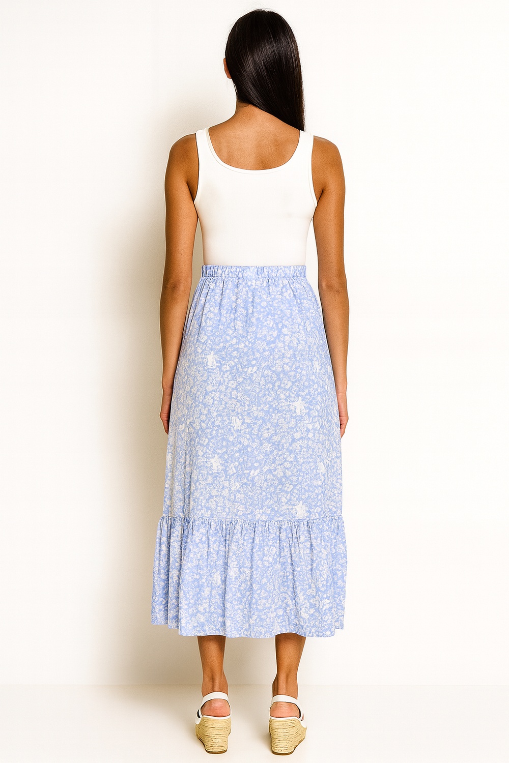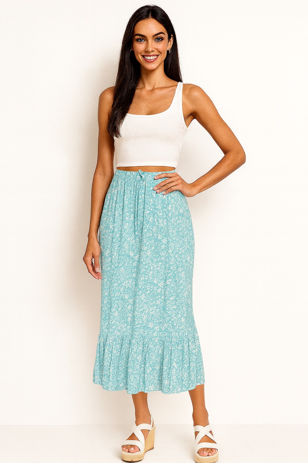 Falda larga de silueta amplia con pretina elástica y jareta frontal ajustable que brinda mejor adaptación, diseño de caída fluida que permite movimiento natural, largo a media pantorrilla con olan inferior que aporta volumen, confección ligera para uso cómodo durante el día