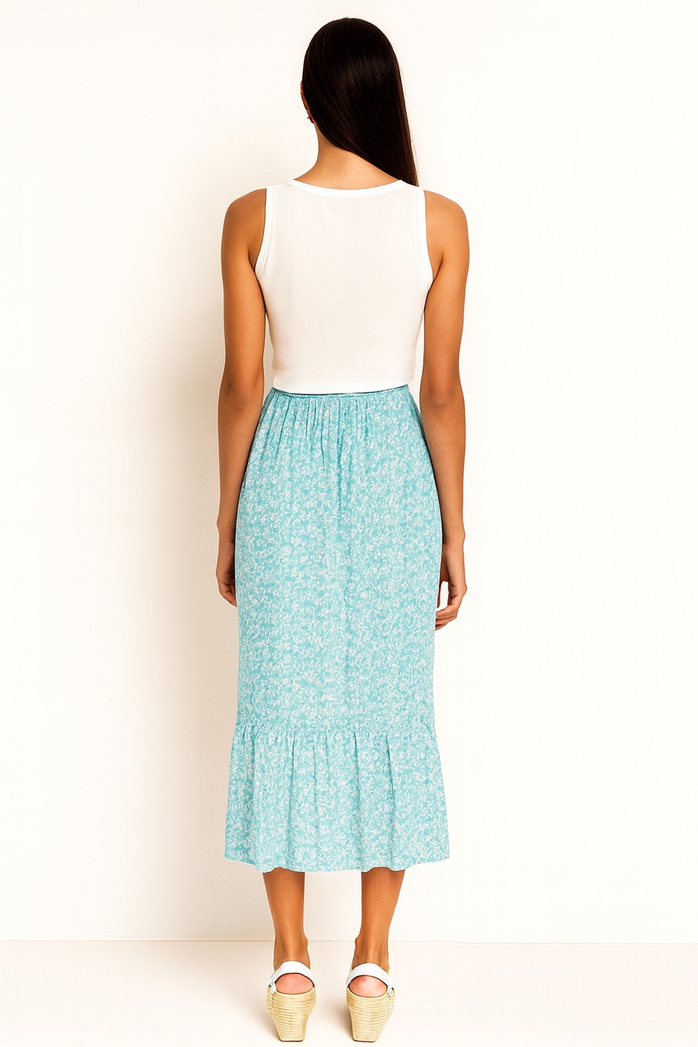 Falda de largo midi con pretina smock elástica que brinda ajuste seguro, caída fluida con movimiento ligero, terminación inferior con olan que aporta volumen controlado, confección con forro interior que mejora la estructura de la prenda