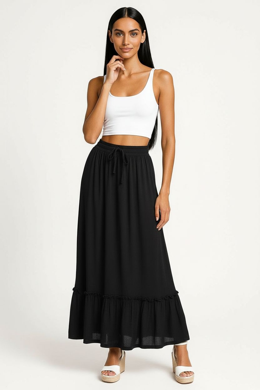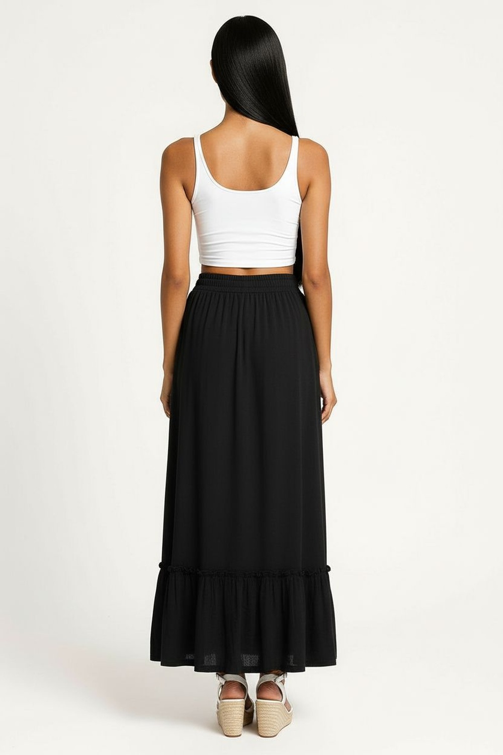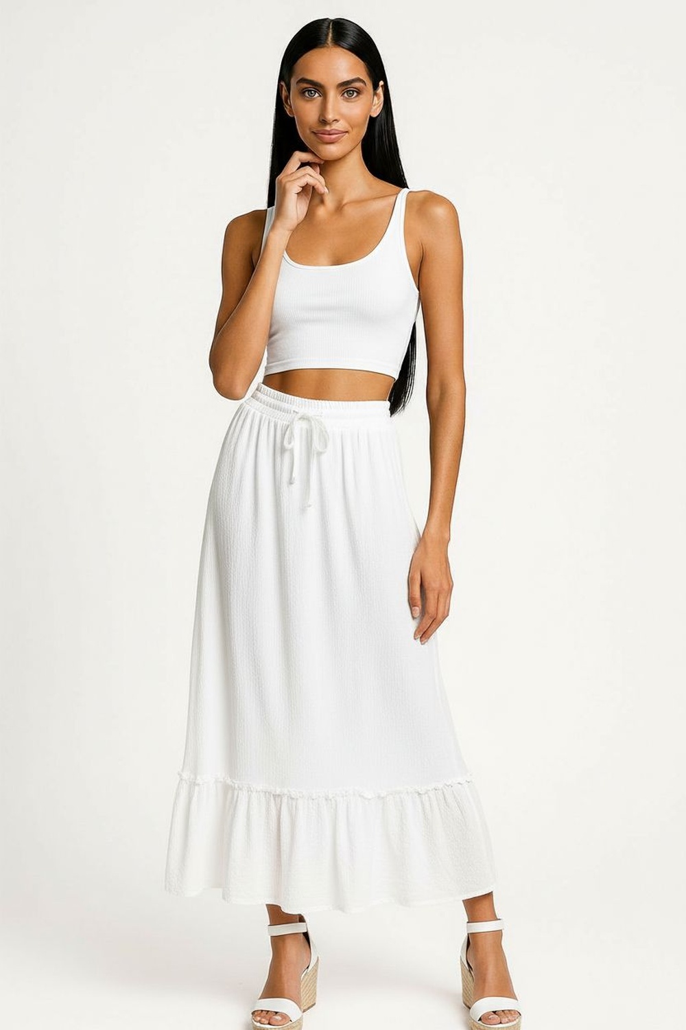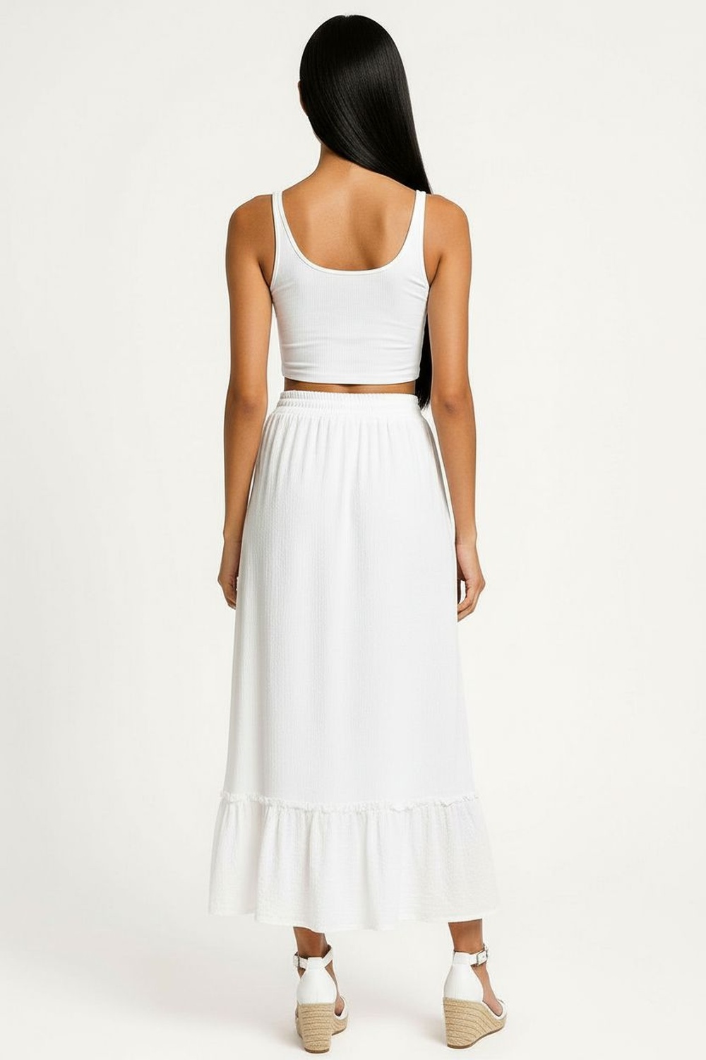 Falda de largo midi con pretina smock elástica que brinda ajuste seguro, caída fluida con movimiento ligero, terminación inferior con olan que aporta volumen controlado, confección con forro interior que mejora la estructura de la prenda