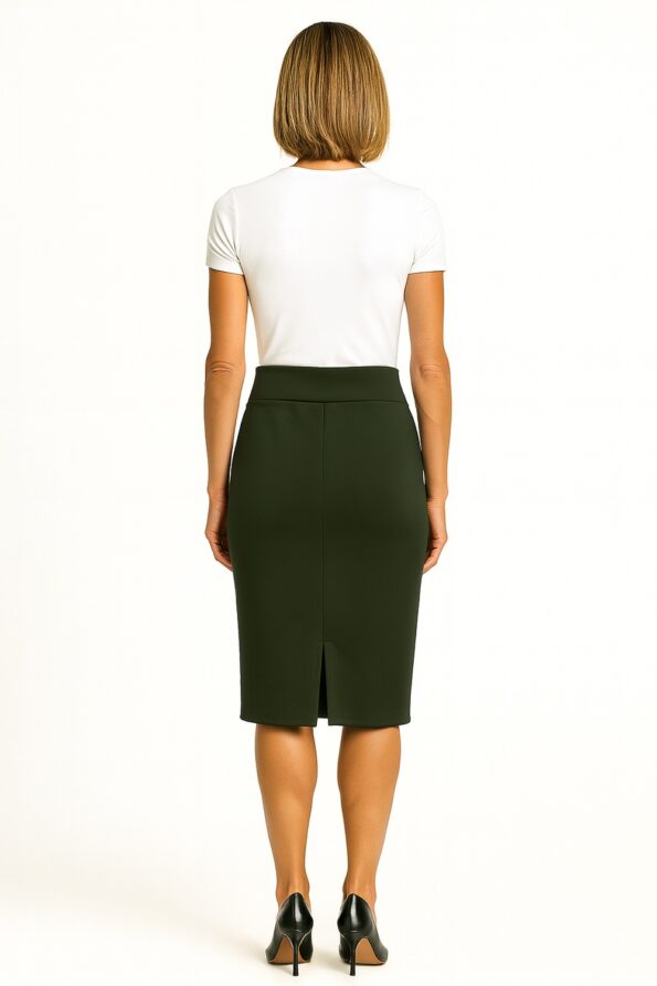 Falda tubo de corte ajustado con pretina ancha que brinda soporte y define la silueta, confección en tejido elástico que permite libertad de movimiento, largo midi que aporta un toque sofisticado y versátil para diferentes ocasiones, acabado pulido que realza su estructura y estilo contemporáneo