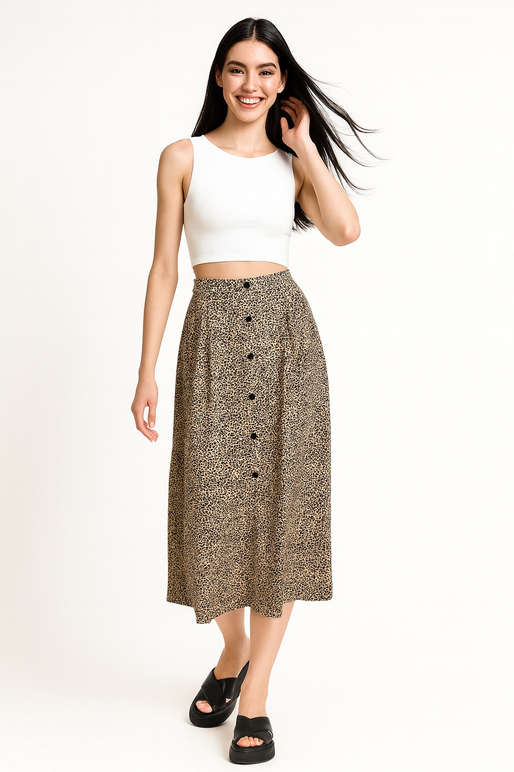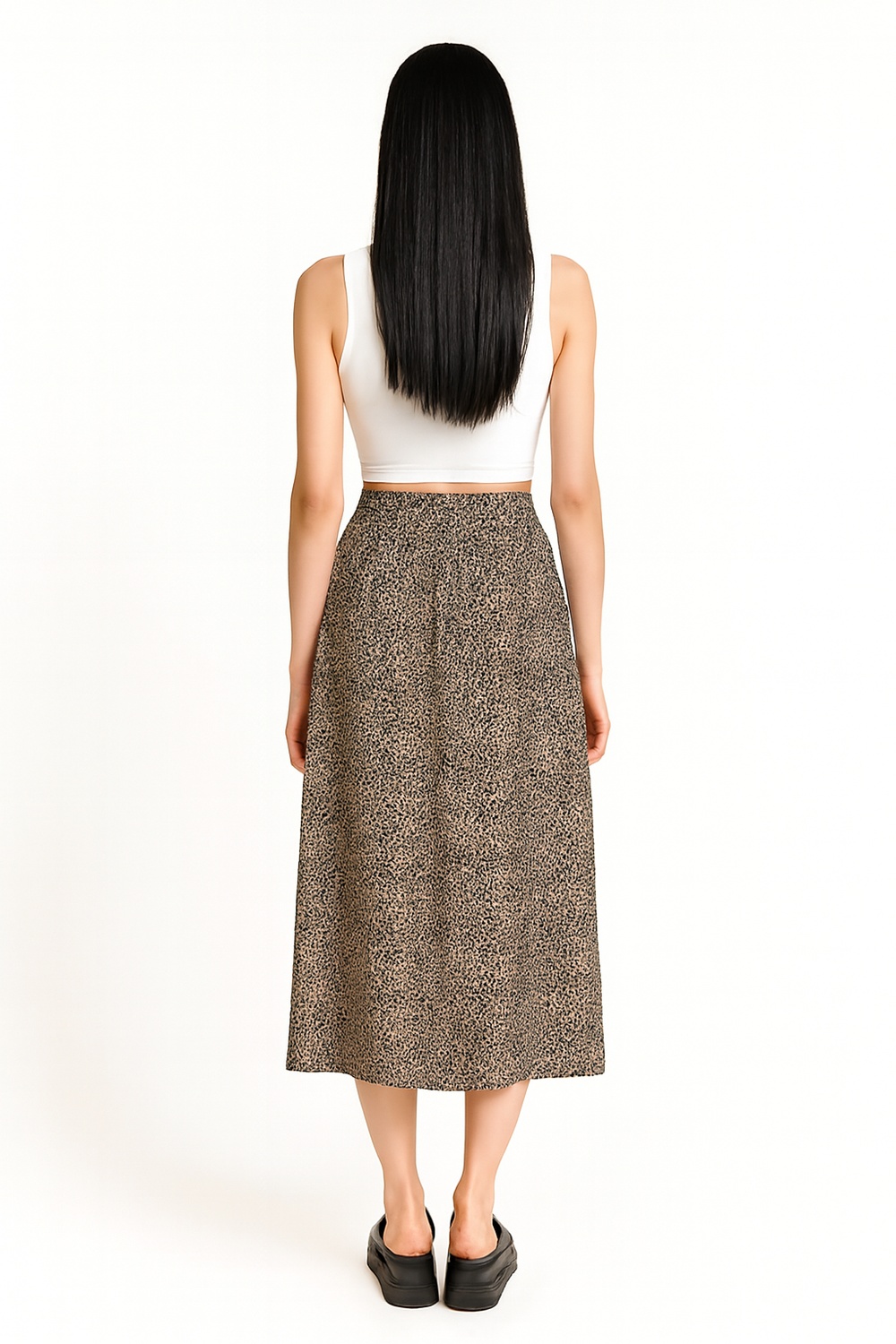 Falda midi de tiro alto con pretina definida que aporta ajuste seguro, diseño con botonadura frontal funcional que añade detalle estructural, corte recto con caída controlada que estiliza la silueta, largo a media pierna que brinda elegancia discreta, confección en tejido ligero de textura agradable que permite comodidad continua