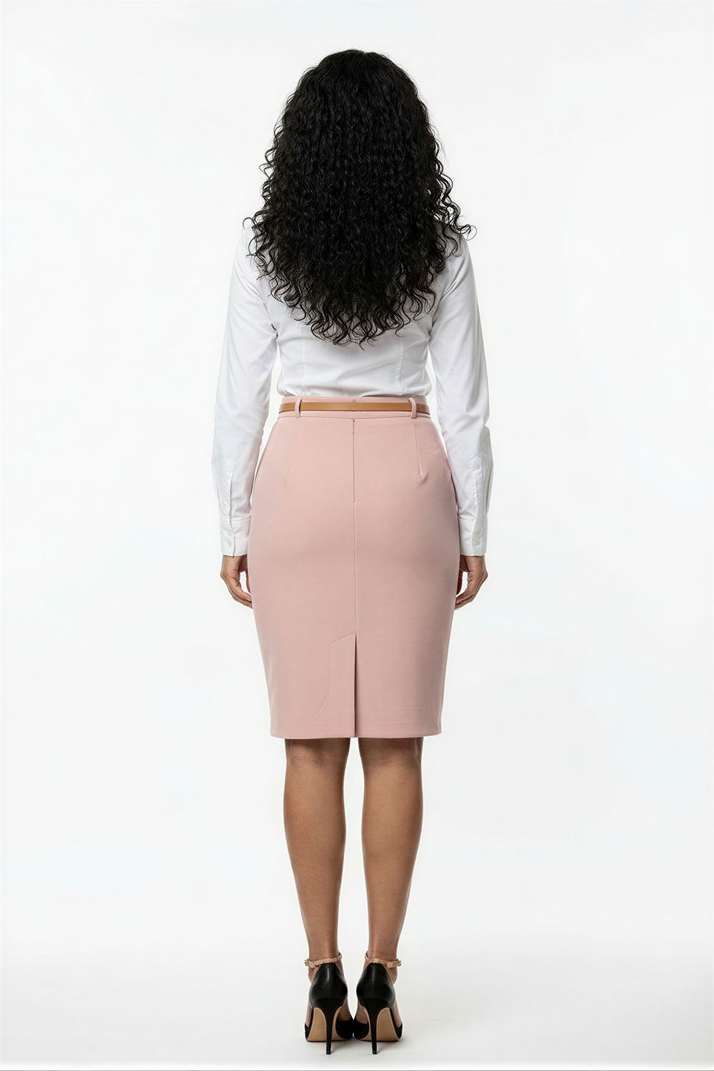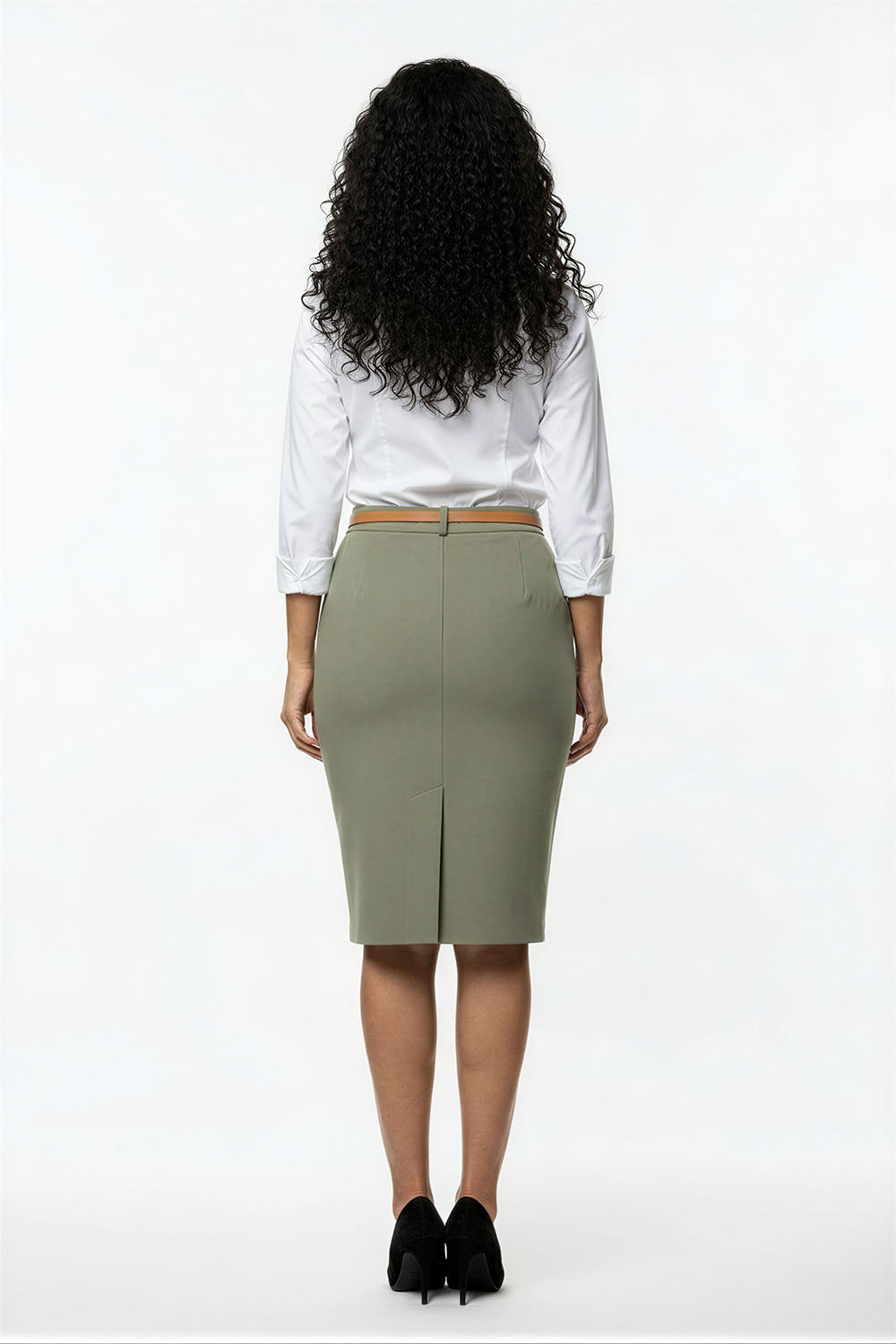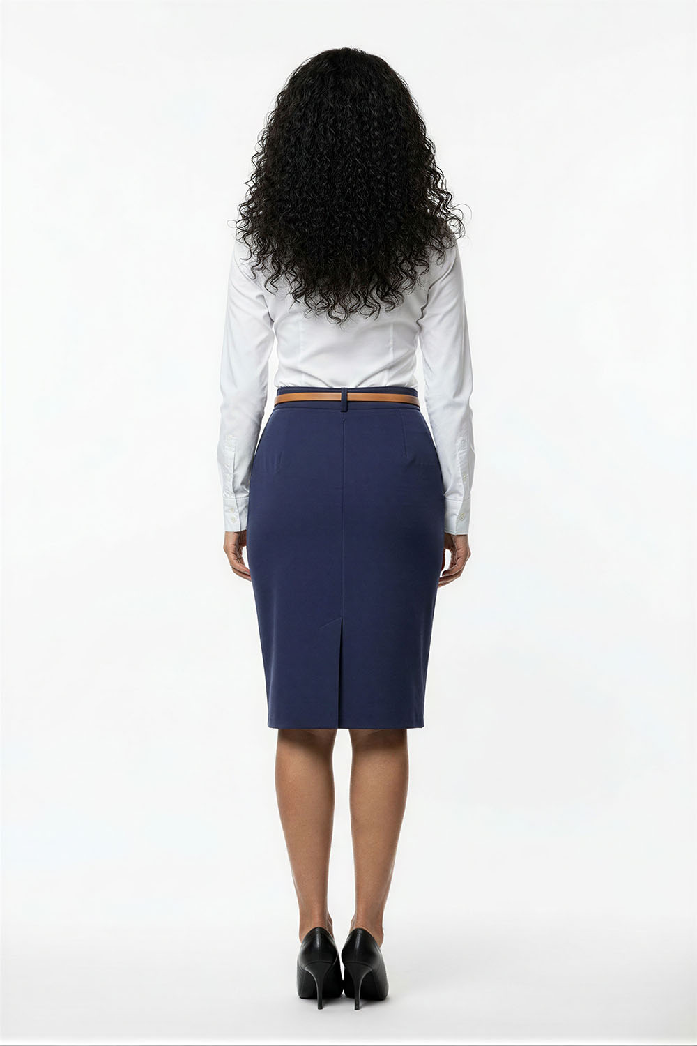 Falda midi de cintura media, pretina limpia, silueta recta, abertura lateral funcional, pespunte marcado, confección estructurada