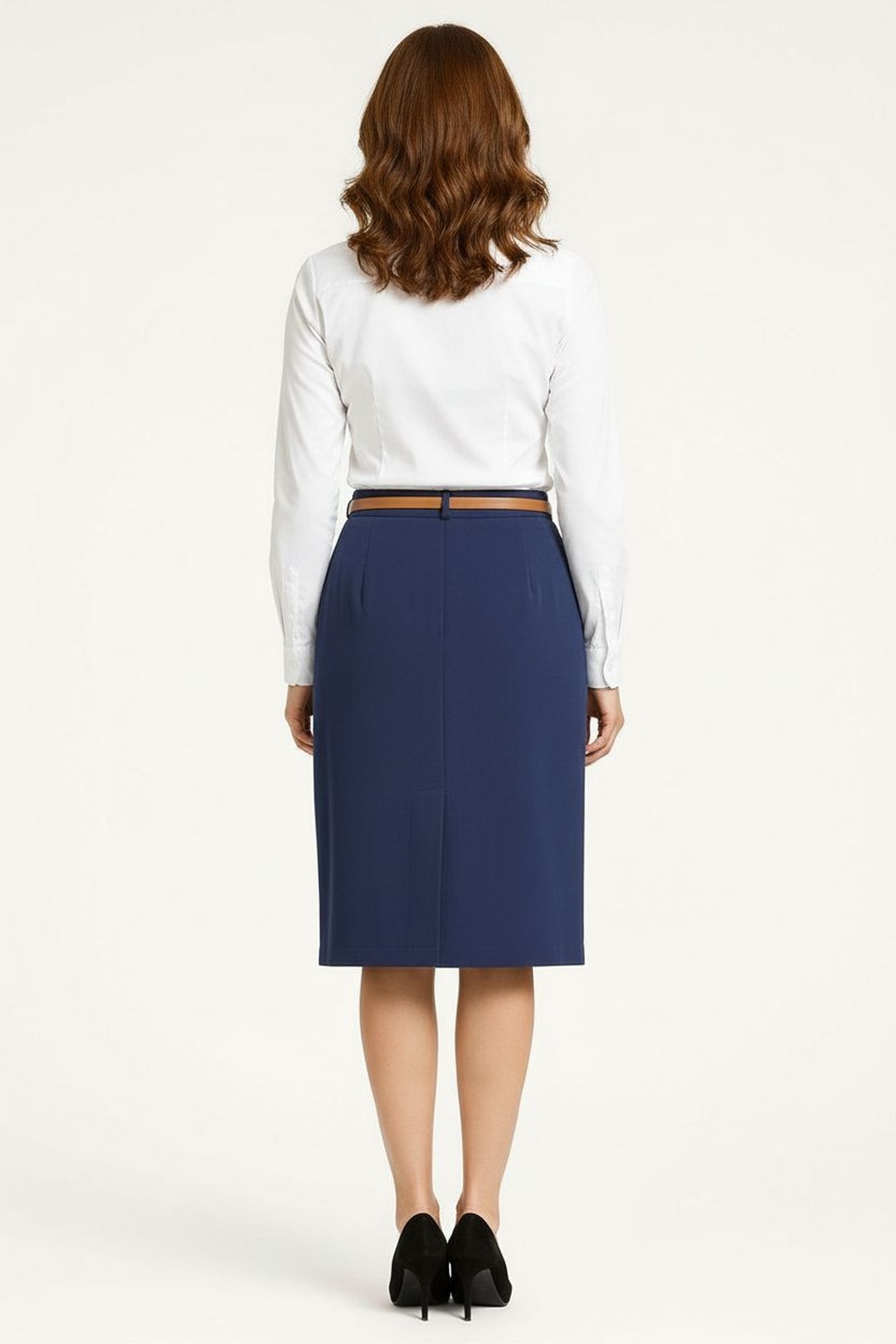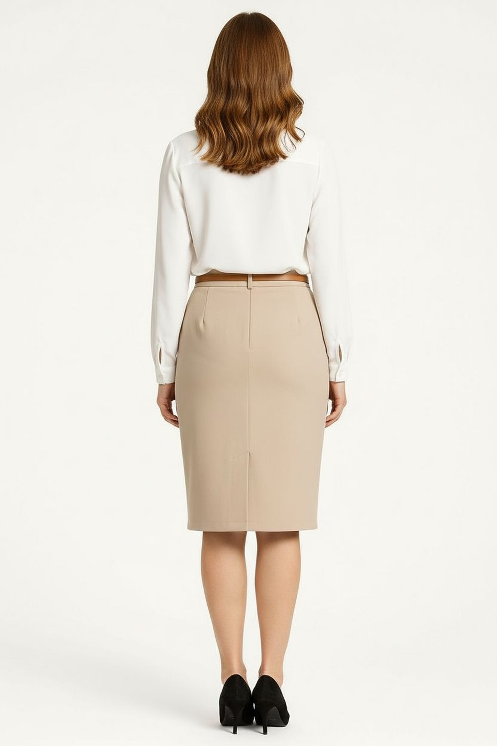 Falda midi de cintura alta, cinturón ajustable con hebilla, estructura recta, largo debajo de rodilla, confección ligera, caída uniforme