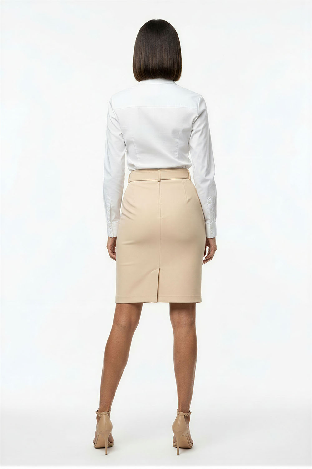 Falda de largo midi con diseño ajustado que define la silueta, pretina con cinturón integrado que permite ajuste personalizado, corte recto que estiliza la figura, abertura sutil que facilita el movimiento, confección firme con acabado estructurado
