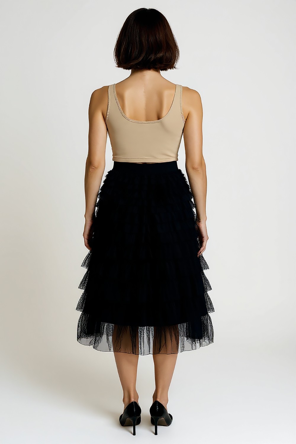 Falda de largo midi confeccionada en tul ligero, diseño de múltiples olanes en capas que aportan volumen y movimiento, pretina ancha elástica que asegura ajuste cómodo y favorecedor