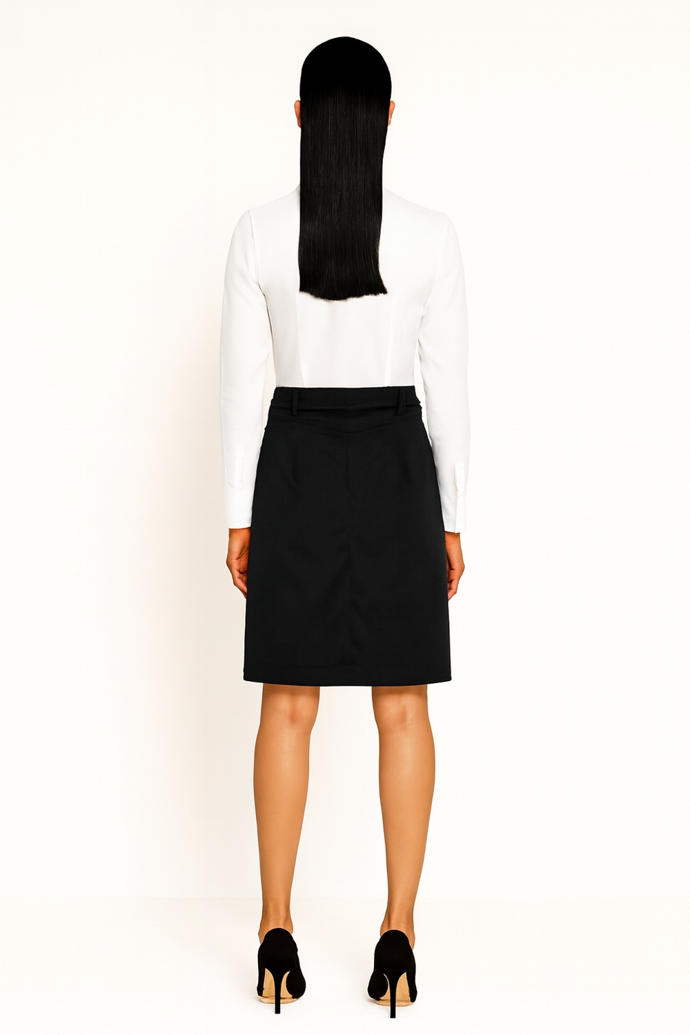 Falda tubo de corte ajustado con pretina ancha que brinda sujeción cómoda, costura trasera que estiliza la figura y aporta mejor ajuste, largo a la rodilla que ofrece un equilibrio entre elegancia y practicidad, confección en tejido firme con elasticidad ligera que se adapta al movimiento, terminaciones limpias que aseguran un acabado pulido y profesional