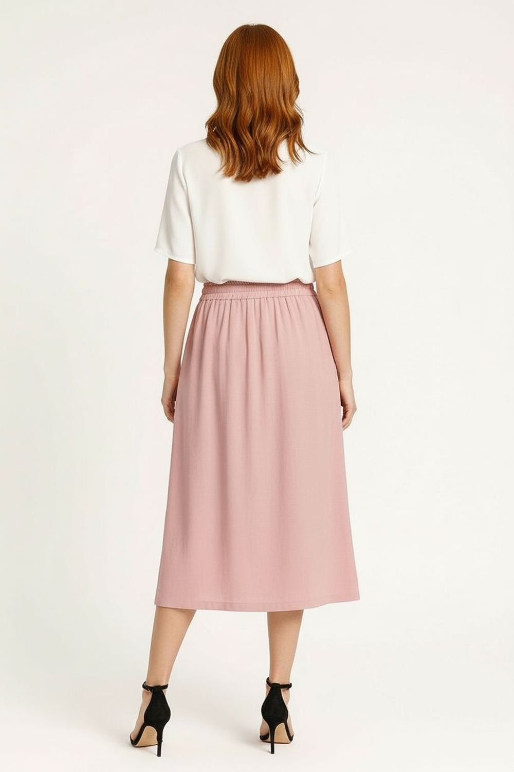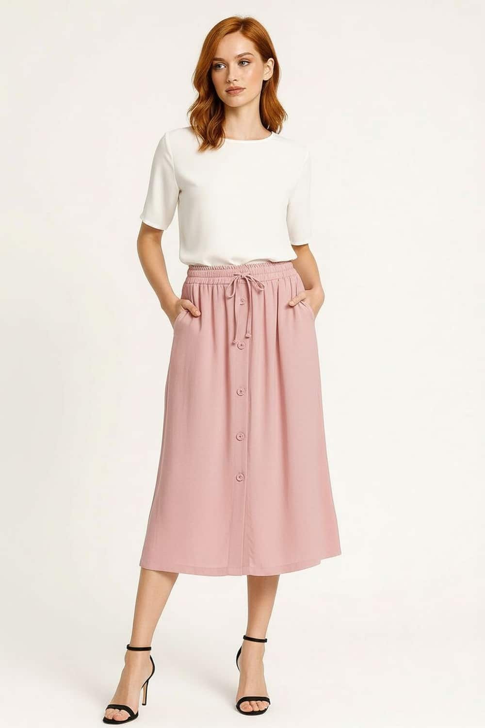 Falda midi con pretina elástica y jareta ajustable al frente, botonadura frontal decorativa que aporta detalle vertical, largo a media pierna que estiliza la figura, caída fluida que brinda movimiento ligero, confección cómoda pensada para uso diario