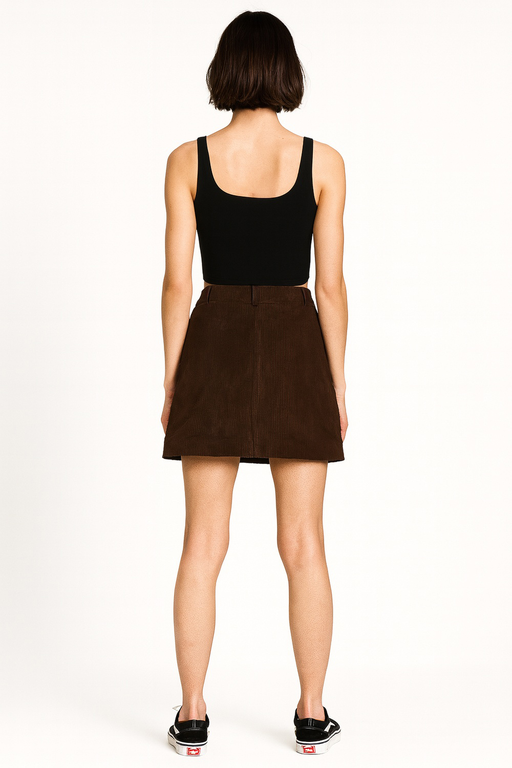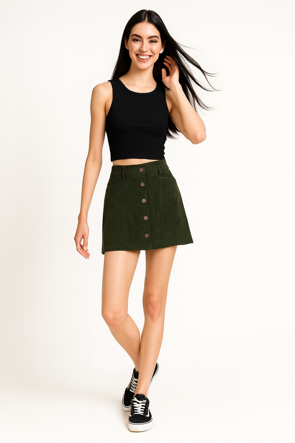 Minifalda confeccionada en tejido tipo panilla de textura acanalada, cintura con pretina ancha y botonadura al frente que aporta detalle visual, diseño ajustado con estructura firme que realza la silueta, acabado resistente ideal para uso cotidiano