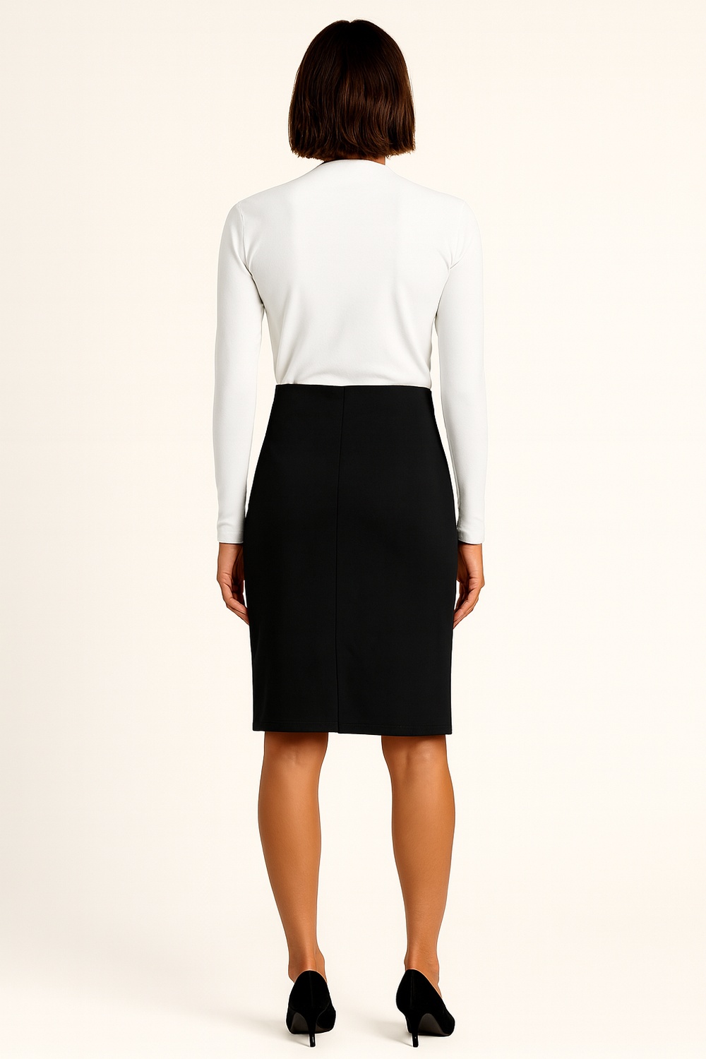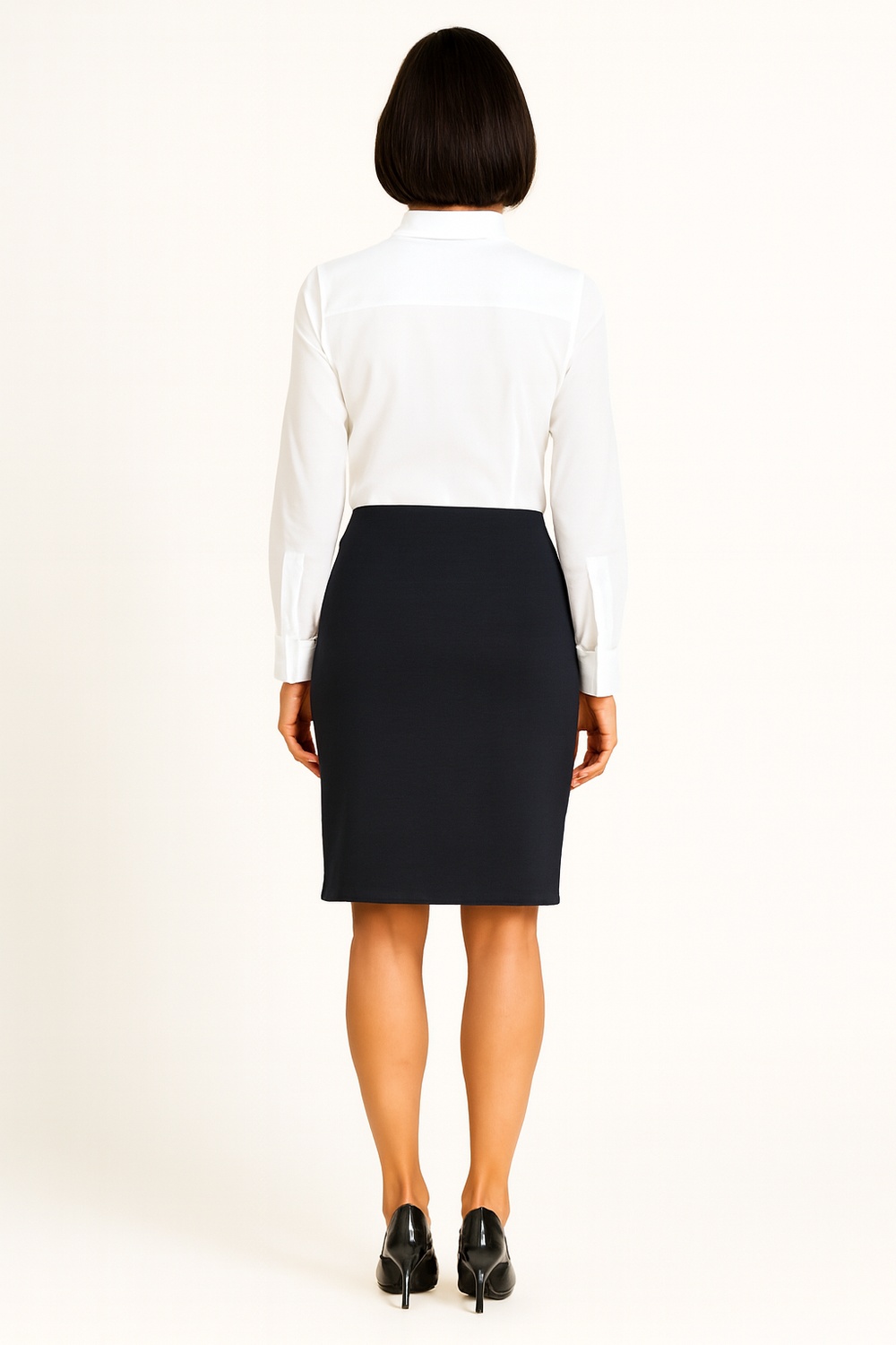 Falda recta de tiro alto con botones decorativos en costados, ajuste que define la figura sin perder comodidad, largo por debajo de la rodilla con presencia pulida, tejido elástico que favorece la movilidad y mantiene la forma