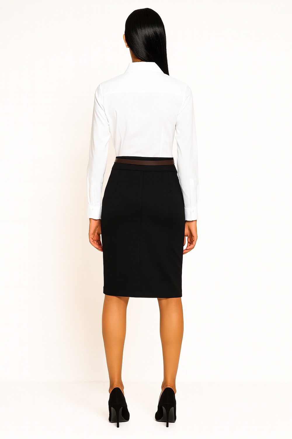 Falda tubo de corte ajustado con pretina ancha que brinda sujeción cómoda, costura trasera que estiliza la figura y aporta mejor ajuste, largo a la rodilla que ofrece un equilibrio entre elegancia y practicidad, confección en tejido firme con elasticidad ligera que se adapta al movimiento, terminaciones limpias que aseguran un acabado pulido y profesional