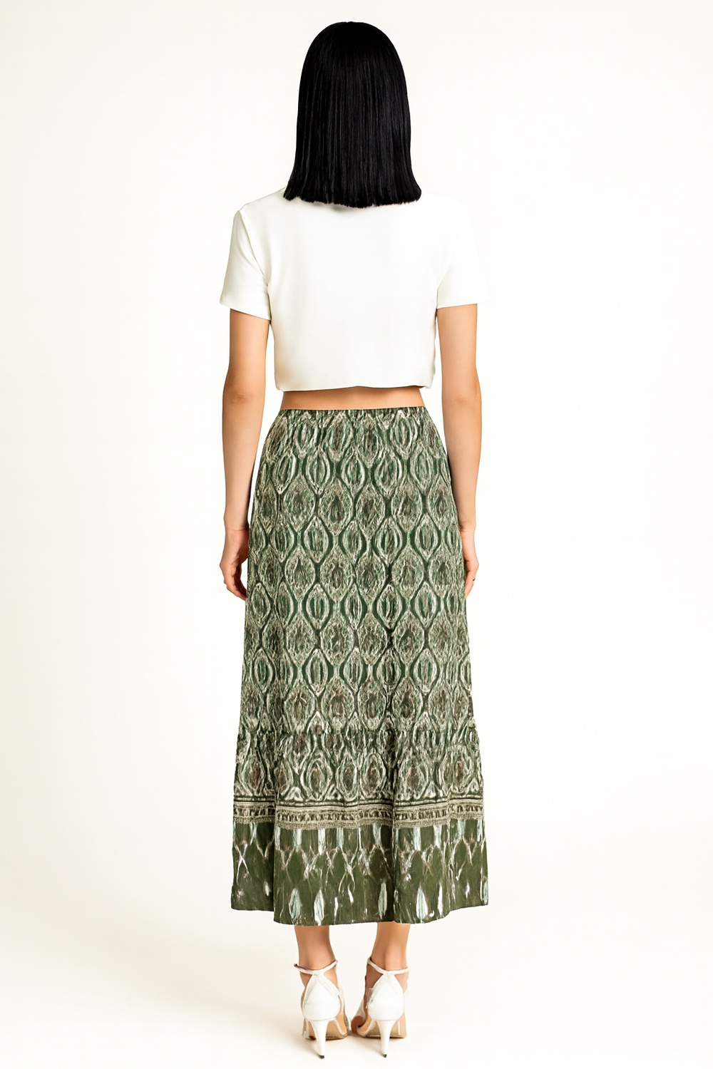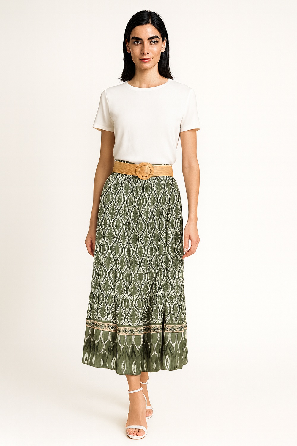 Falda de largo midi con pretina elástica que se ajusta a la cintura con comodidad, cinta decorativa al frente que realza el diseño, bolsas laterales funcionales que aportan practicidad y detalle moderno, confección en tela fresca con caída natural