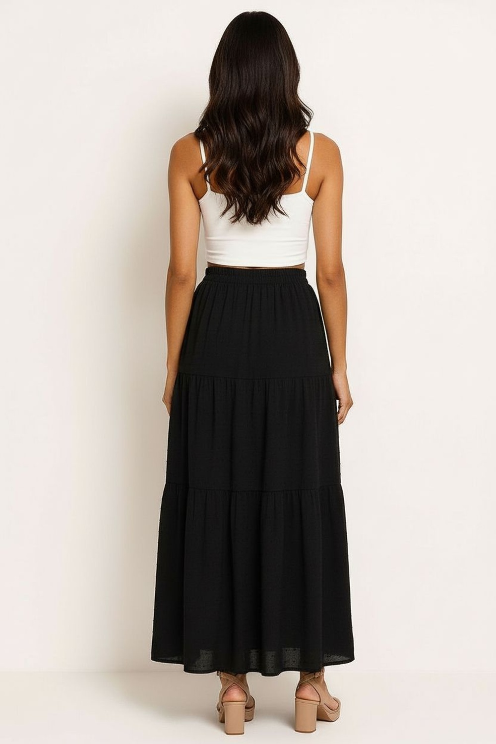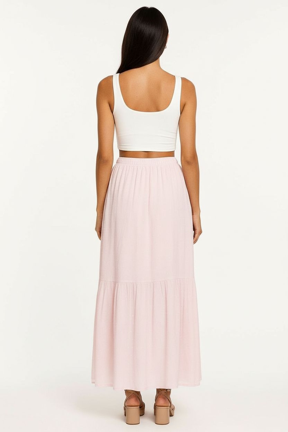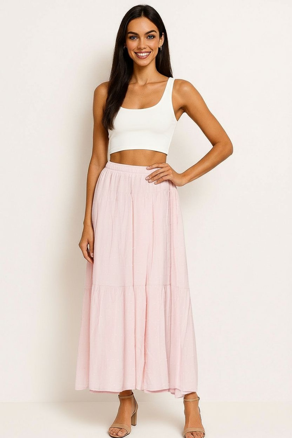 Falda larga de corte amplio con pretina cómoda y cinturón ajustable que define la cintura, diseño en bloques con olanes que generan volumen y movimiento fluido, largo midi con caída ligera que estiliza la silueta, confección fresca y suave que brinda comodidad durante todo el día