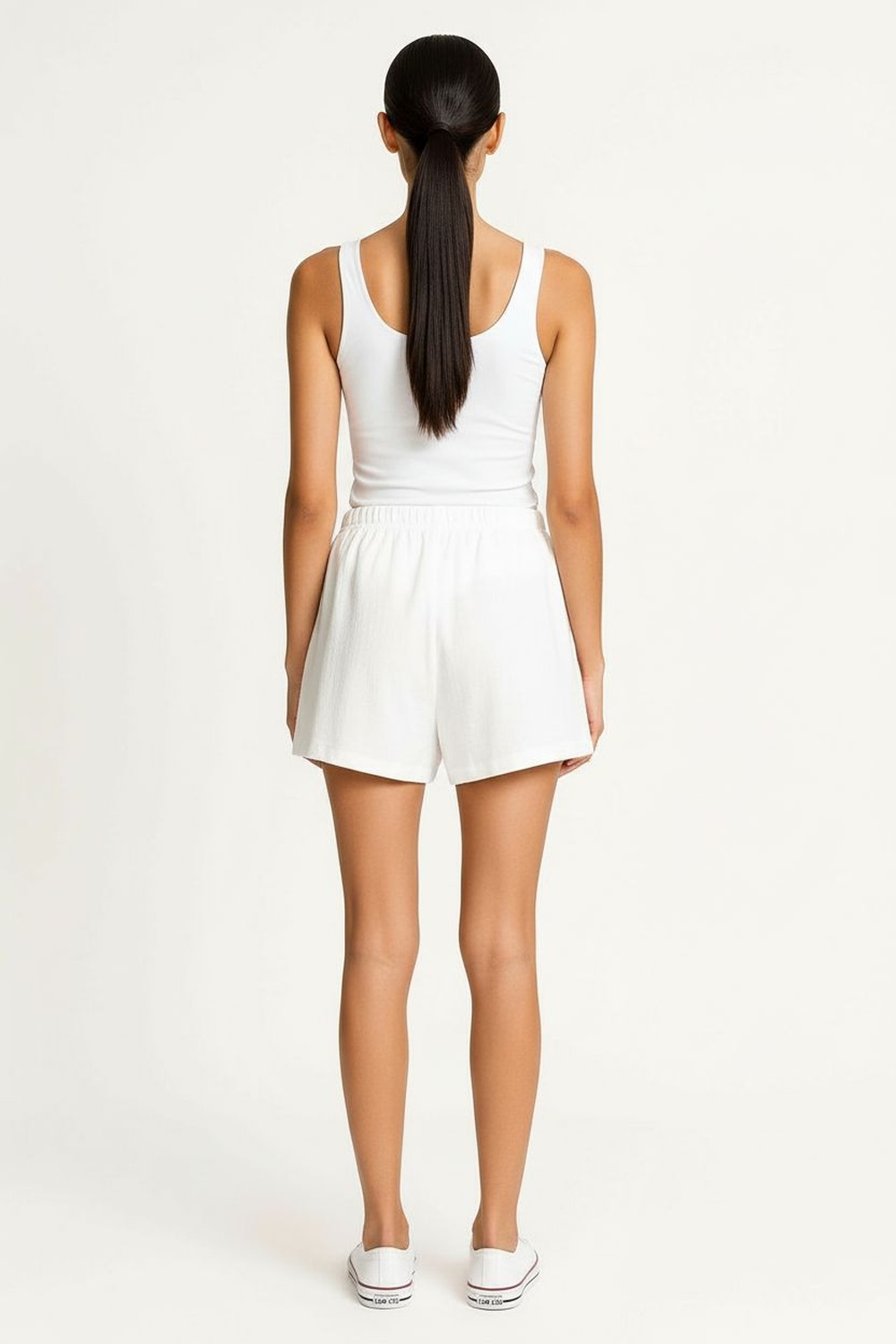 Short de tiro medio con pretina elástica que brinda ajuste cómodo y seguro, cinta funcional al frente que permite regular la sujeción, corte recto con largo corto que facilita el movimiento, confección en tejido suave de tacto ligero que aporta comodidad durante el uso diario, acabados limpios en bastilla que mantienen la estructura de la prenda