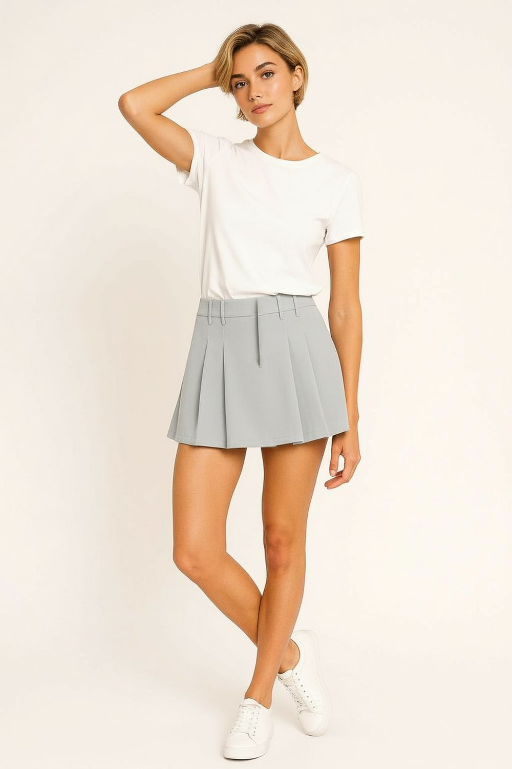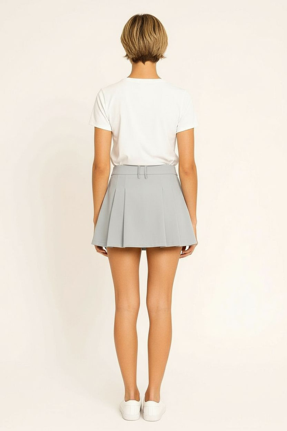 Minifalda con pretina estructurada, diseño con tablas, cierre discreto, silueta amplia, caída firme