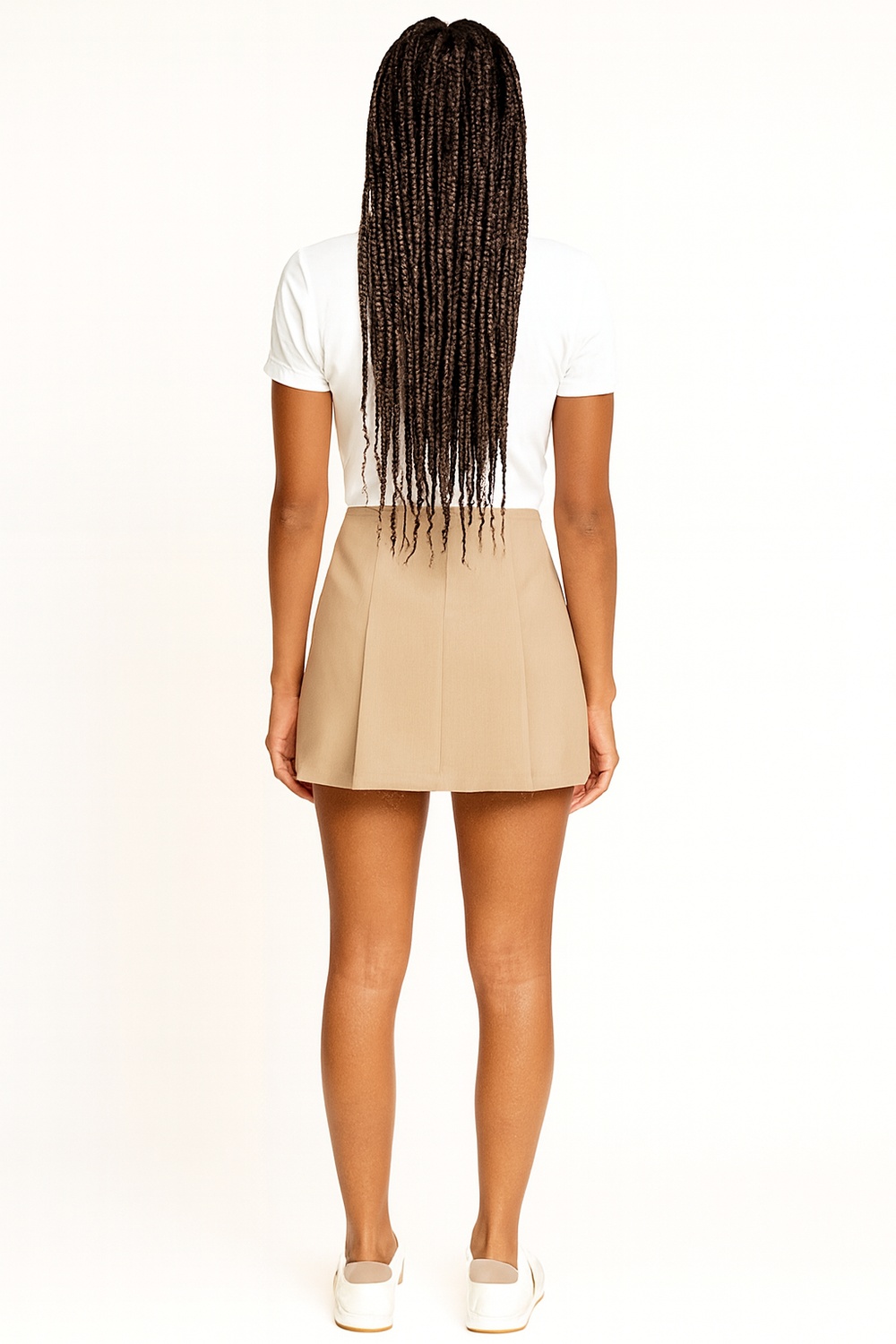 Falda corta con diseño de tablones que aporta volumen y movimiento dinámico, pretina ancha que asegura un ajuste firme y cómodo en la cintura, corte superior estructurado que realza la silueta, largo por encima de la rodilla que brinda un estilo juvenil y versátil, confección en tela resistente que conserva la forma de los pliegues y garantiza durabilidad