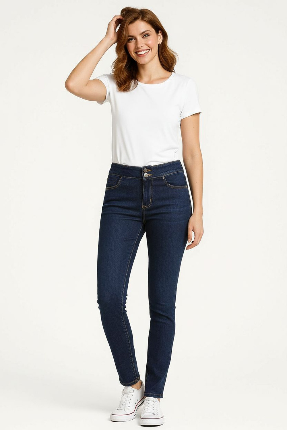 Jeans corte ajustado con pretina alta, cierre frontal con botón y cremallera, diseño que realza la silueta, estructura firme con acabado limpio