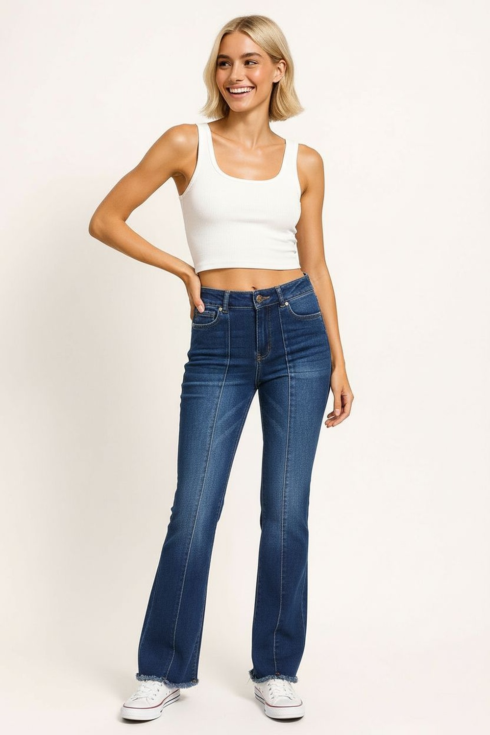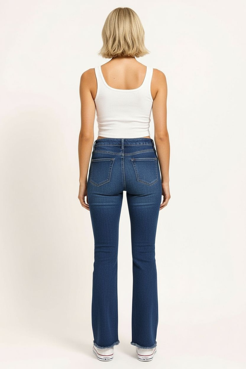 Jeans de tiro medio con cierre frontal y botón metálico, corte ajustado en cadera y muslo con apertura tipo campana en la parte inferior, confección en mezclilla firme con ajuste cómodo, diseño clásico de cinco bolsas y presillas para cinturón, terminación en bajo ligeramente acampanado que estiliza la silueta