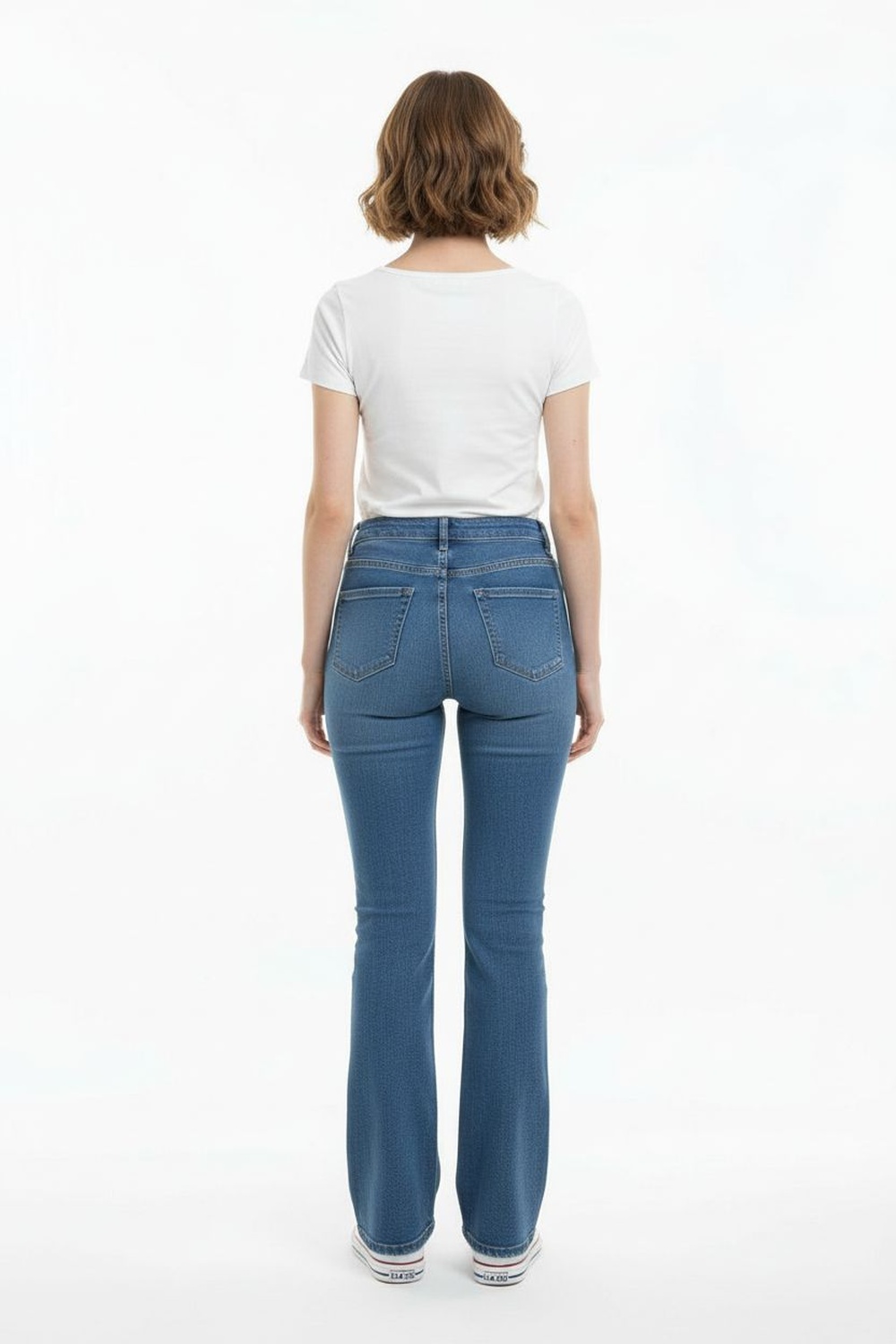 Jeans de tiro alto, cierre frontal con botón, diseño de cinco bolsillos, ajuste en cadera y muslo, pierna con apertura amplia