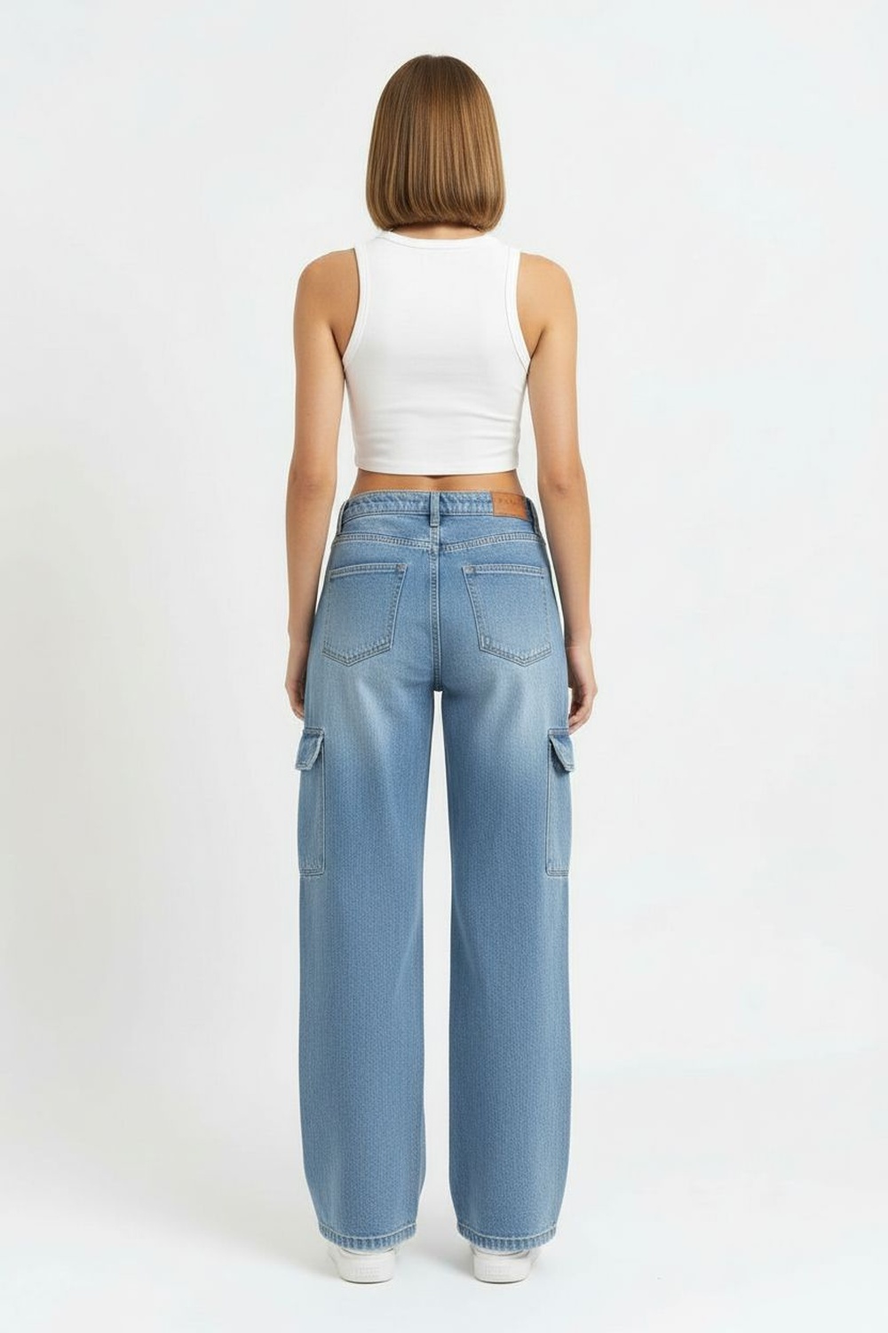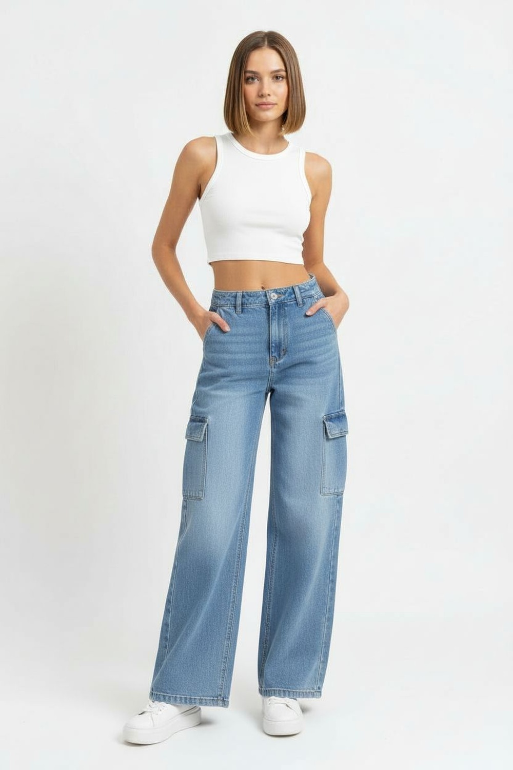 Jeans de tiro medio con pretina y botón, cierre frontal, bolsillos laterales tipo cargo con tapa, bolsillos traseros funcionales, silueta recta amplia, acabado en mezclilla