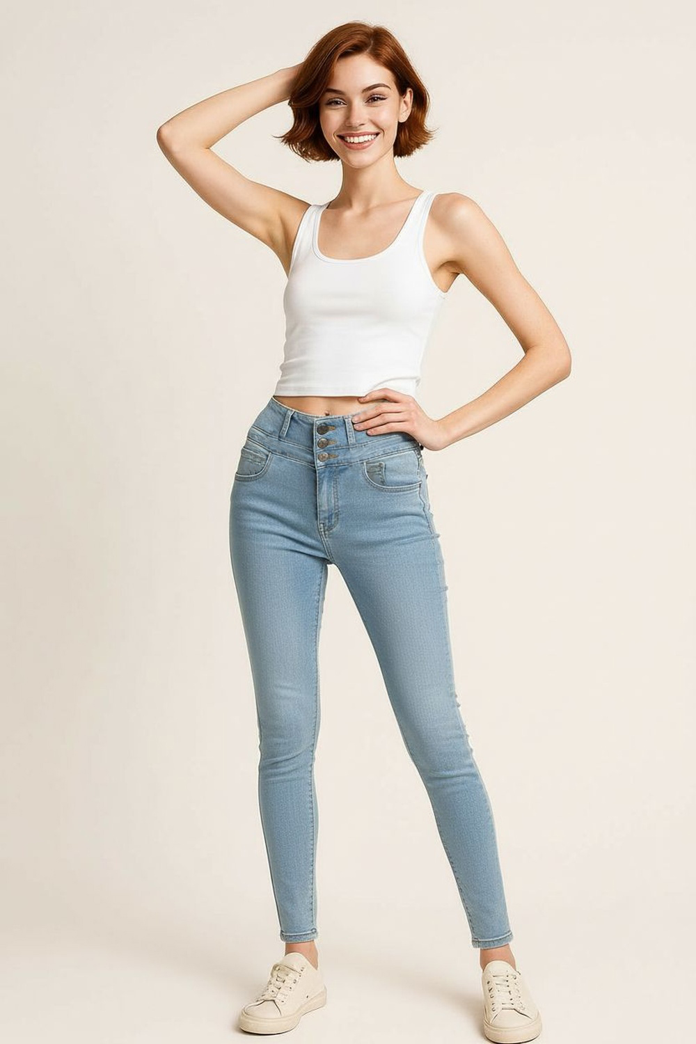 Pantalón de tiro alto con pretina estructurada y cierre frontal con botones funcionales, corte skinny que define la pierna, confección en mezclilla elástica que brinda ajuste cómodo, bolsillos funcionales y largo completo al tobillo
