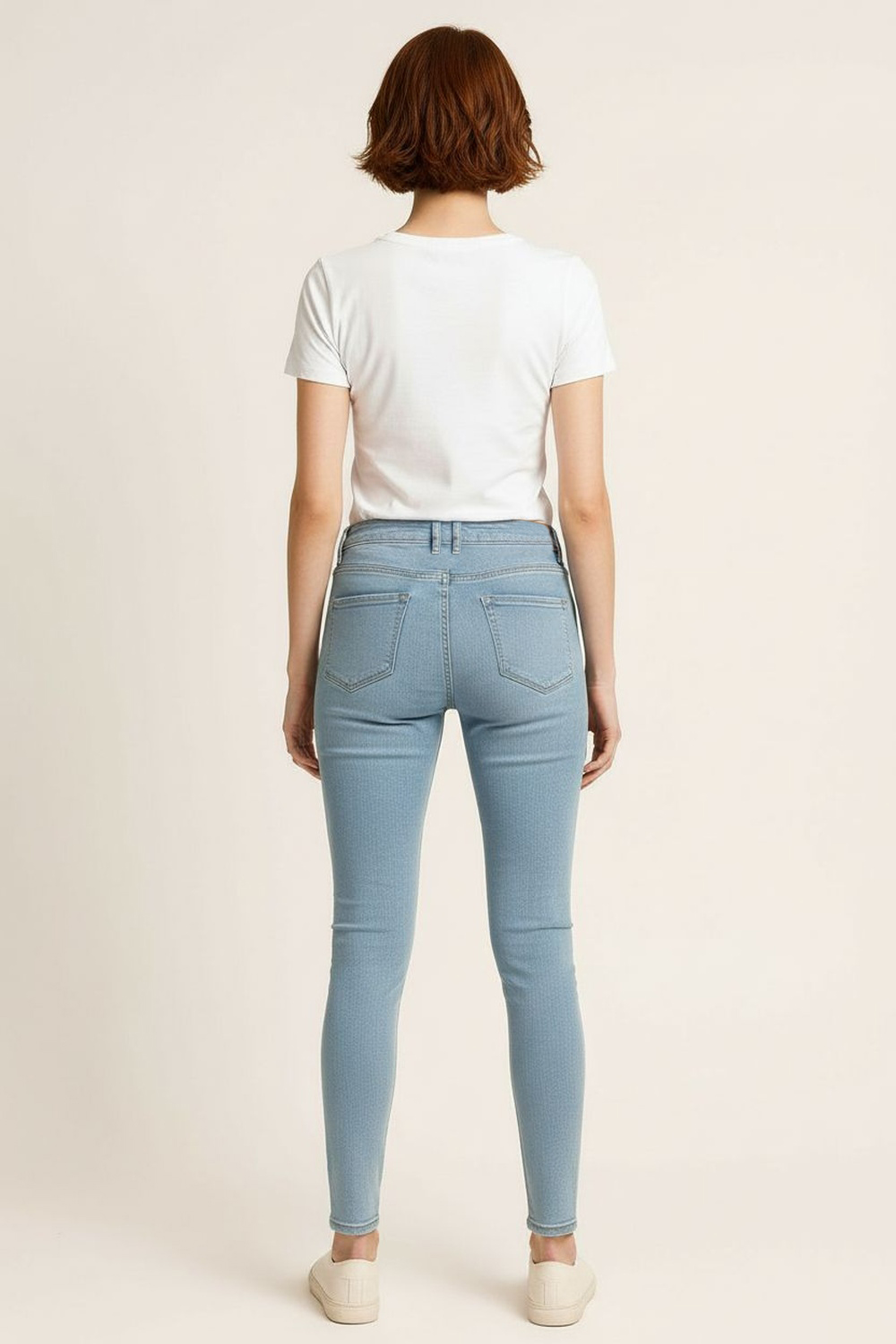 Pantalón skinny de tiro medio con pretina anatómica y cierre frontal con botón metálico, corte ajustado desde cadera hasta tobillo que estiliza la figura, diseño levanta pompa que realza la parte posterior, bolsillos funcionales y trabillas para cinturón que aportan practicidad, mezclilla con elasticidad que facilita el movimiento y brinda ajuste cómodo