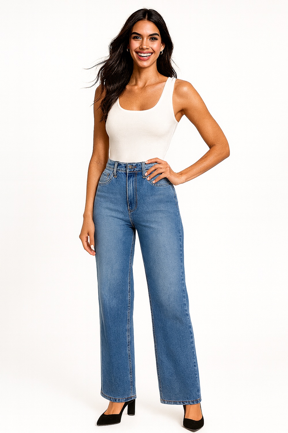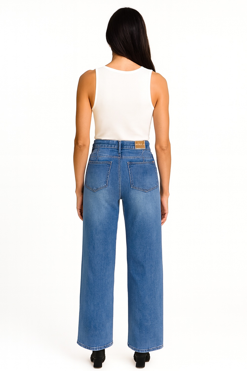 Pantalón de tiro alto con pretina ancha que define la cintura, bolsillos traseros de diseño estructurado que realzan la forma natural, confección en mezclilla con elasticidad que ofrece ajuste perfecto y comodidad, terminado limpio que aporta un toque casual