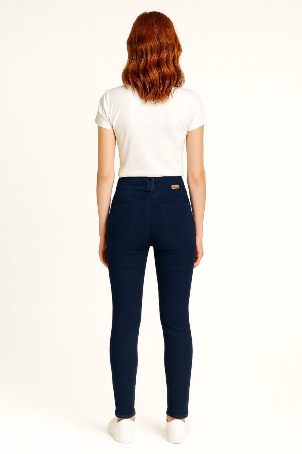 Jeans de mezclilla con diseño de tiro alto que estiliza la figura, detalle de triple botón frontal que aporta firmeza y estilo, confección con pespuntes en contraste que destacan su estructura, tejido elástico que brinda ajuste y comodidad