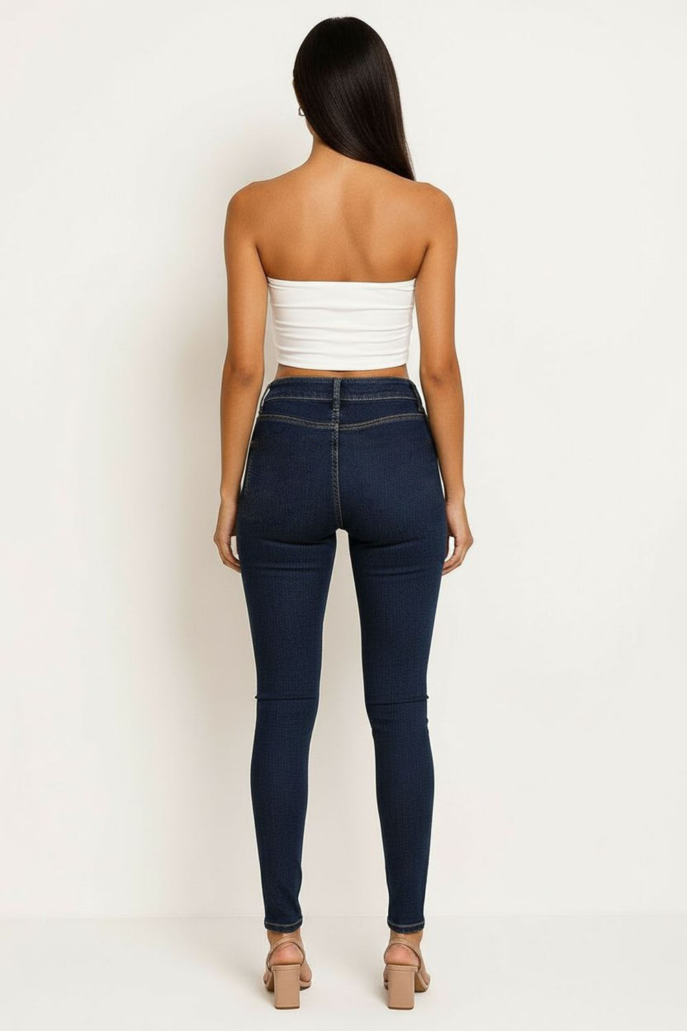 Jeans skinny con pretina clásica y cierre frontal con botón metálico, diseño posterior con pinzas estratégicas que realzan la silueta, confeccionado en mezclilla elástica que brinda soporte y comodidad, cinco bolsas funcionales que aportan practicidad y acabado moderno ideal para looks casuales de temporada