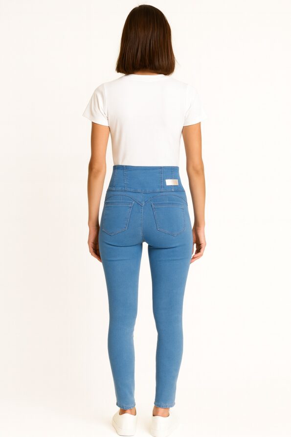 Jeans de mezclilla con pretina ancha que moldea la cintura, diseño ajustado que realza la figura, cierre frontal con botones metálicos decorativos, confeccionado en tejido elástico que ofrece soporte, confort y libertad de movimiento