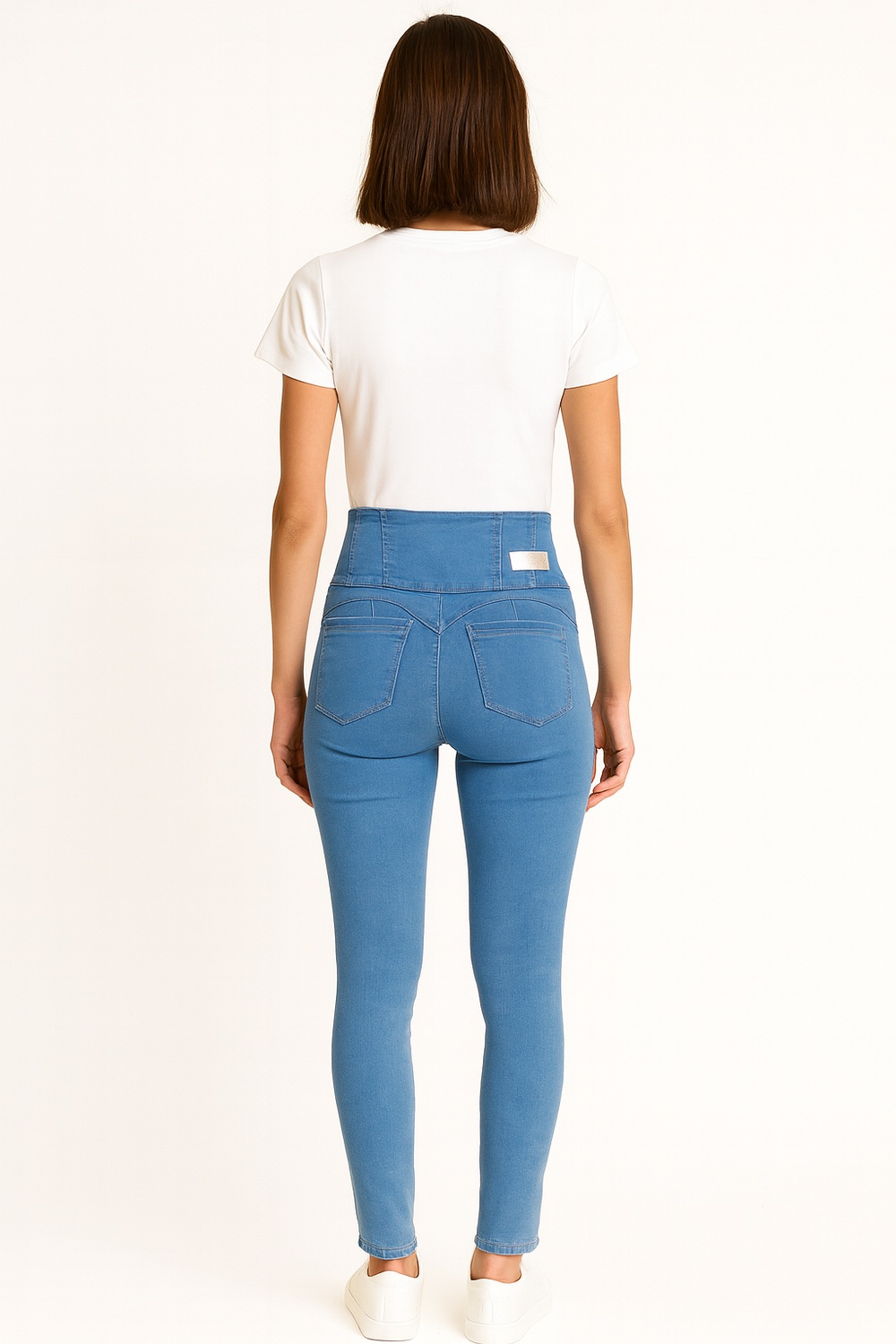 Jeans de mezclilla con pretina ancha de doble altura que brinda control y definición a la cintura, pespuntes verticales que estilizan la figura, cierre frontal con botones metálicos decorativos, tejido elástico que permite un ajuste perfecto y comodidad