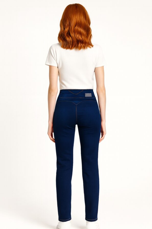 Jeans de mezclilla con pretina ancha de doble altura que brinda control y definición a la cintura, pespuntes verticales que estilizan la figura, cierre frontal con botones metálicos decorativos, tejido elástico que permite un ajuste perfecto y comodidad