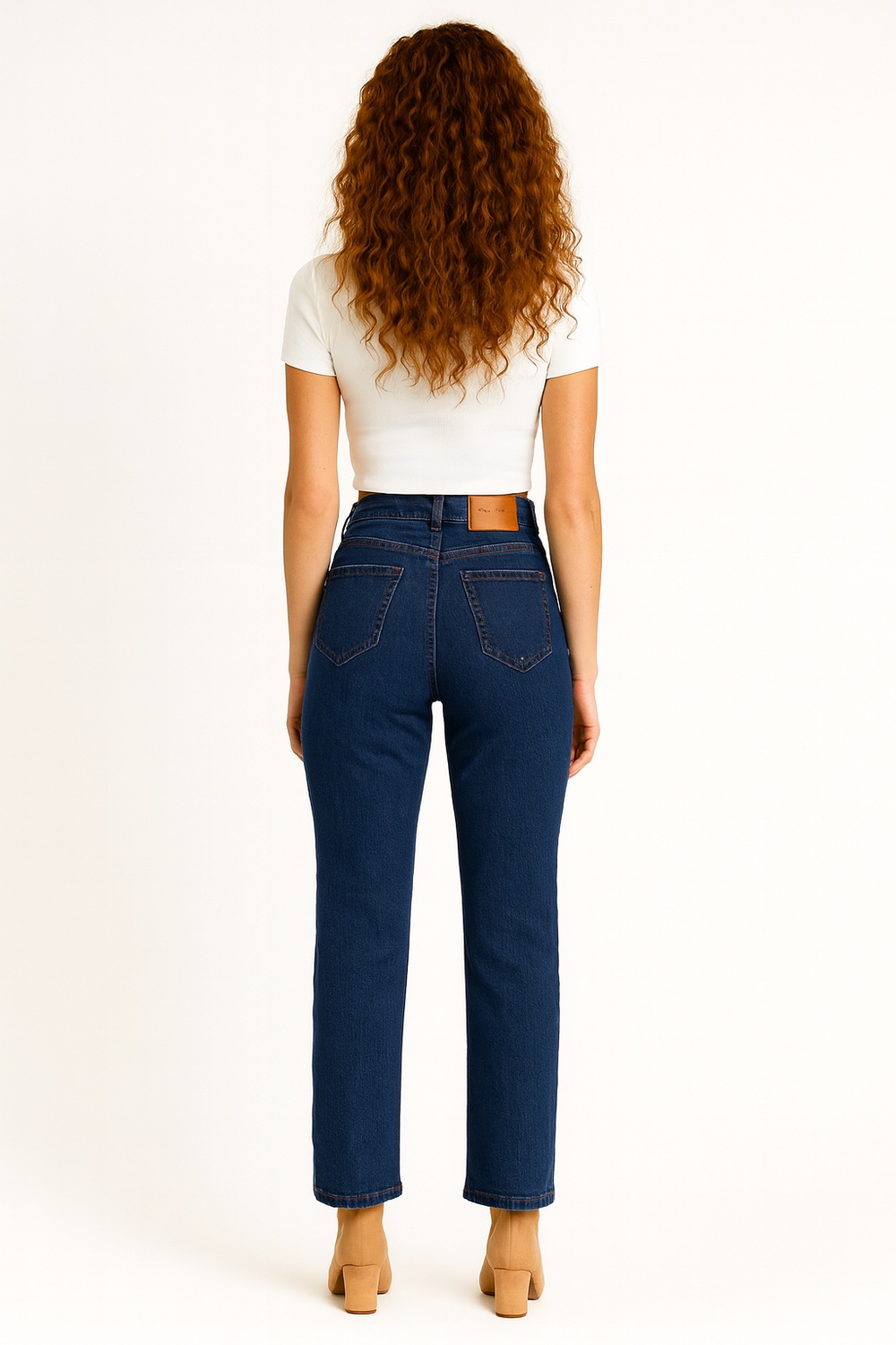Jeans de tiro medio con pretina de pasadores que aseguran ajuste firme, bolsillos delanteros y traseros funcionales con costuras contrastantes que realzan el diseño, corte ajustado que moldea la figura y favorece la silueta, dobladillo con acabado sencillo que permite versatilidad en el uso, confección en mezclilla resistente con tacto suave que aporta comodidad y durabilidad