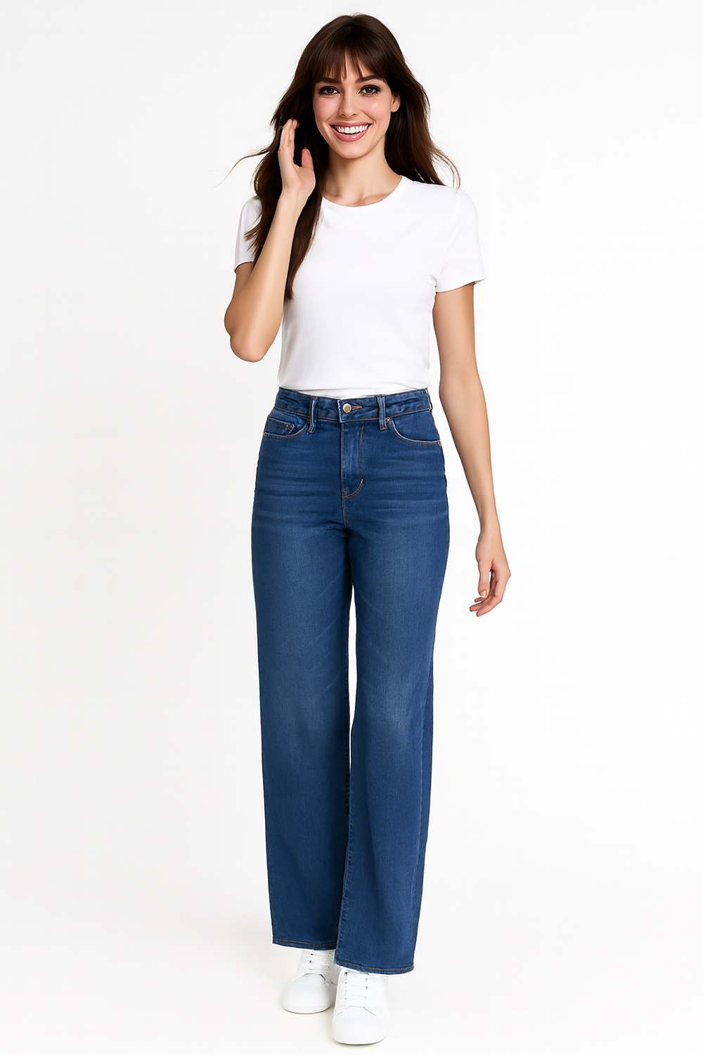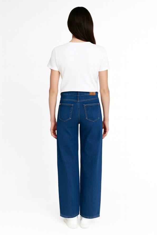 Jeans de tiro alto con corte amplio que brinda comodidad y libertad de movimiento, diseño de cinco bolsas funcionales que aporta practicidad, confeccionados en mezclilla resistente con textura suave que conserva su forma, pretina con trabillas y cierre frontal con botón metálico
