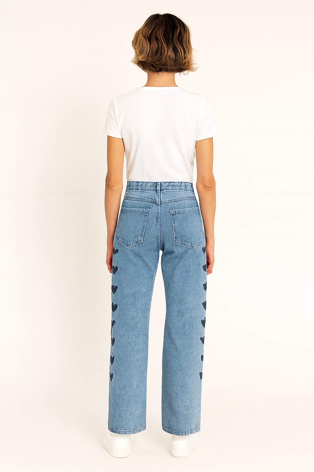 Jeans de tiro medio con corte amplio de pierna recta que aporta comodidad, diseño de cinco bolsas funcionales que brindan practicidad, cierre frontal con botón y cremallera para ajuste seguro, aplicaciones decorativas en pierna que añaden un toque distintivo, confección en mezclilla resistente con estructura firme y caída recta hasta el tobillo