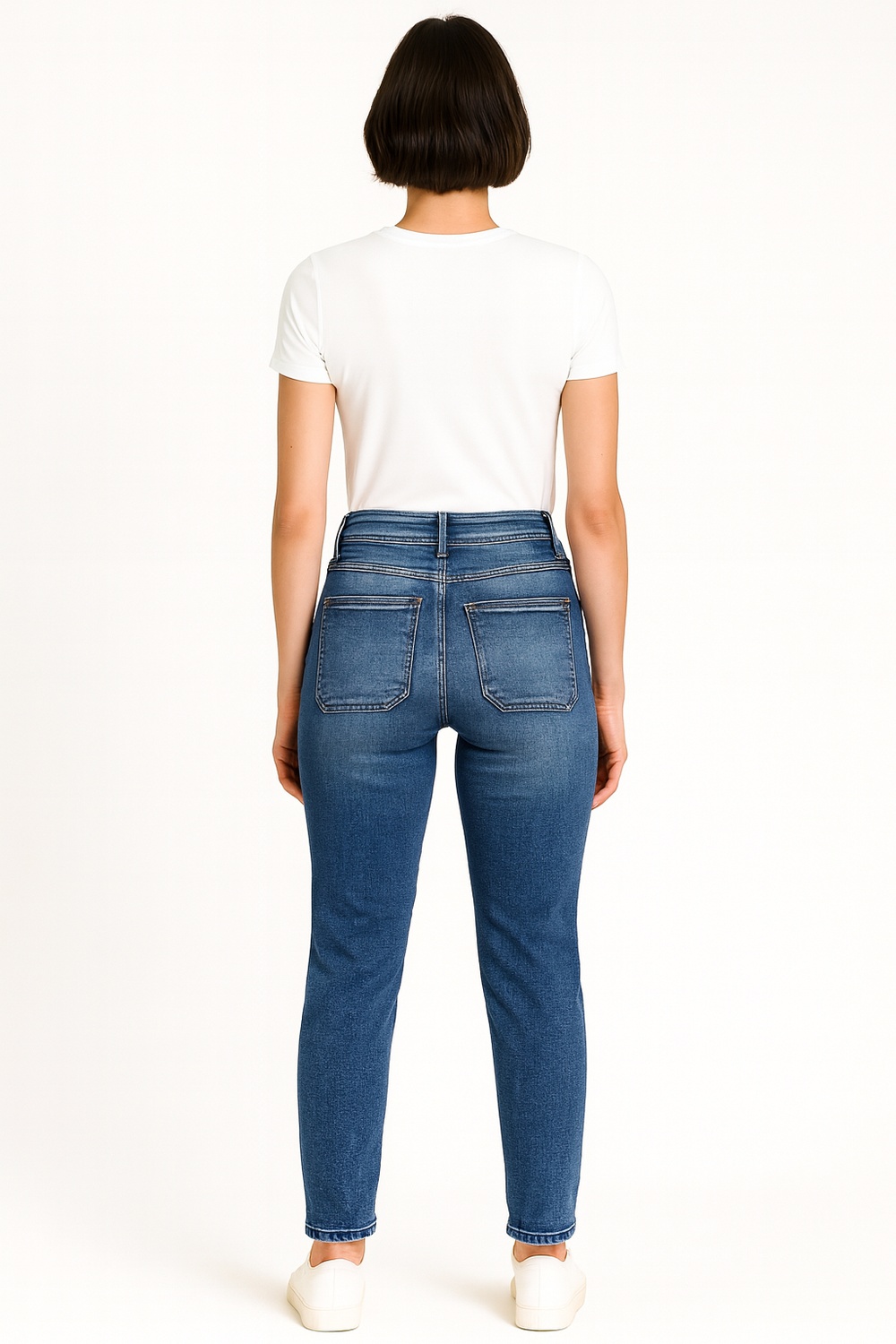 Jeans NYD confeccionado en mezclilla con corte ajustado y cintura media, diseño de cinco bolsillos funcionales que aportan practicidad, cierre con botón metálico al frente y costuras firmes que definen la estructura, tejido con leve elasticidad que brinda confort y mejor ajuste al cuerpo