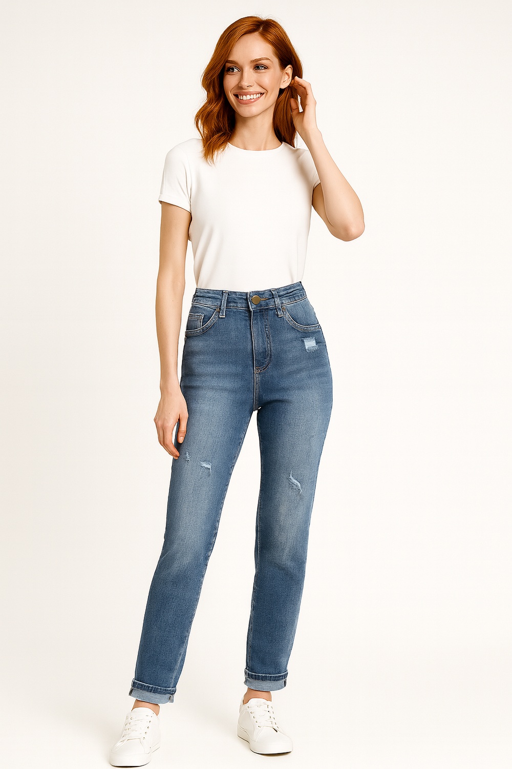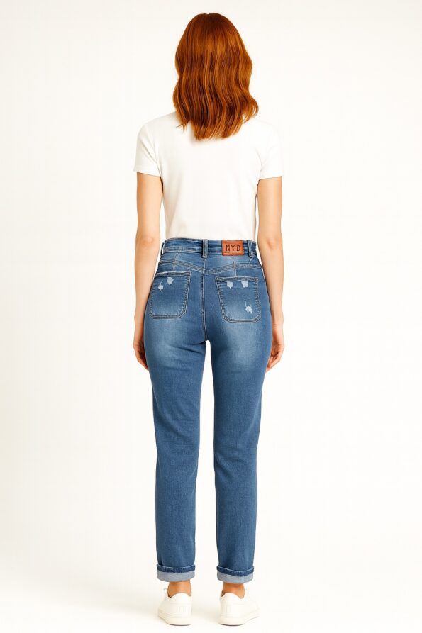 Jeans de mezclilla con tiro medio y diseño ajustado que realza la figura, detalles de roturas que aportan un estilo moderno y casual, cinco bolsas funcionales que ofrecen practicidad, confeccionado en denim elástico que brinda confort y libertad de movimiento
