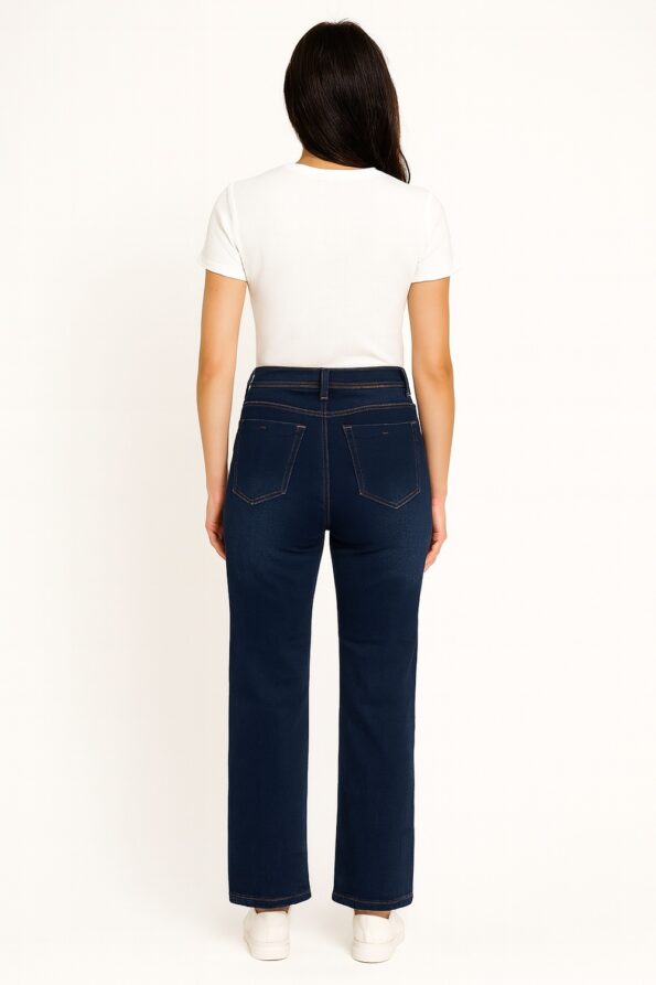 Jeans de mezclilla con pretina ancha de doble altura que brinda control y definición a la cintura, pespuntes verticales que estilizan la figura, cierre frontal con botones metálicos decorativos, tejido elástico que permite un ajuste perfecto y comodidad