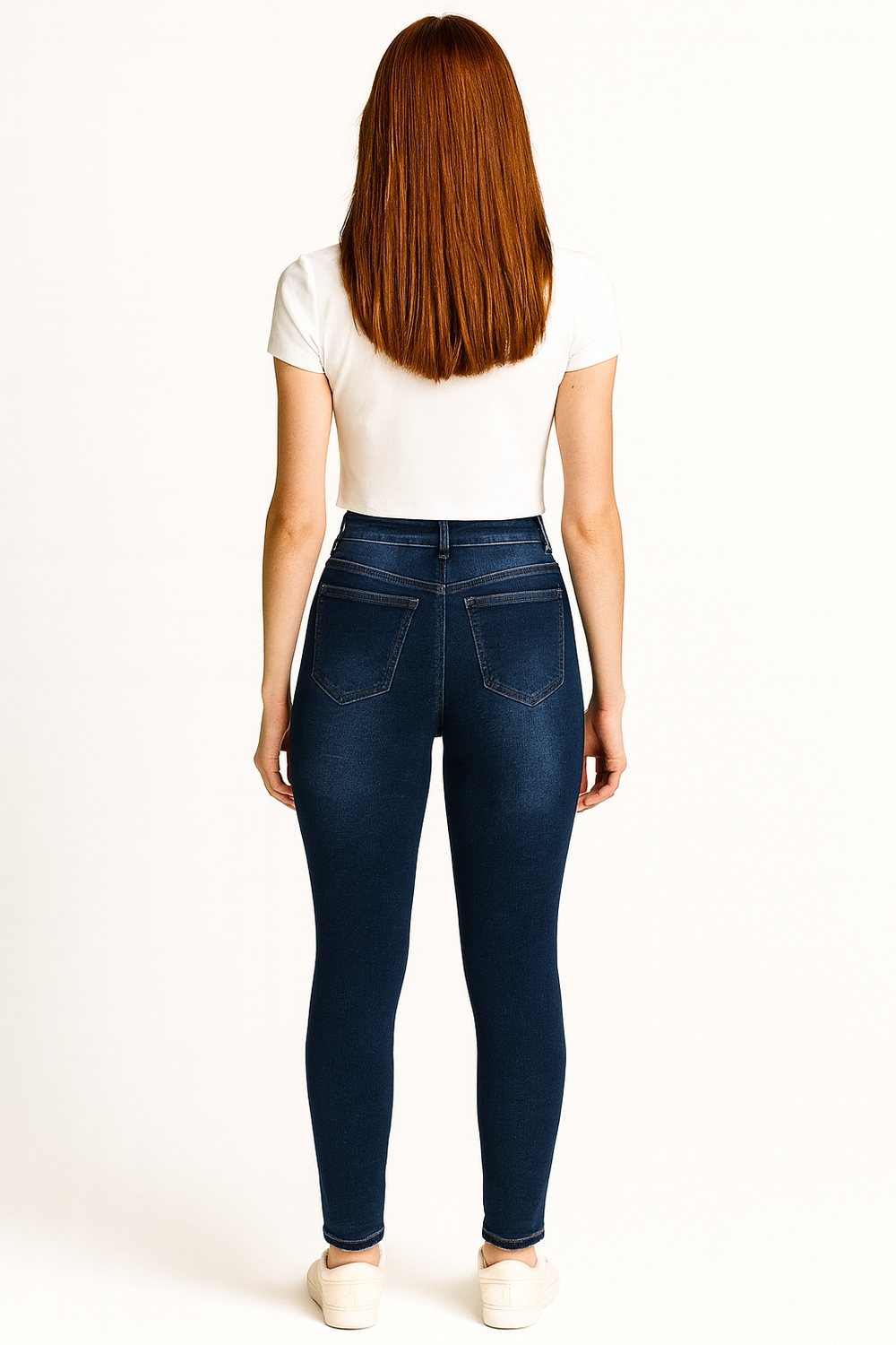 Pantalón de tiro medio con pretina delgada y cierre de botón metálico, bolsillos funcionales al frente y en la parte posterior que aportan practicidad, confección en mezclilla con elasticidad que brinda ajuste cómodo y libertad de movimiento, acabado limpio que resalta la figura