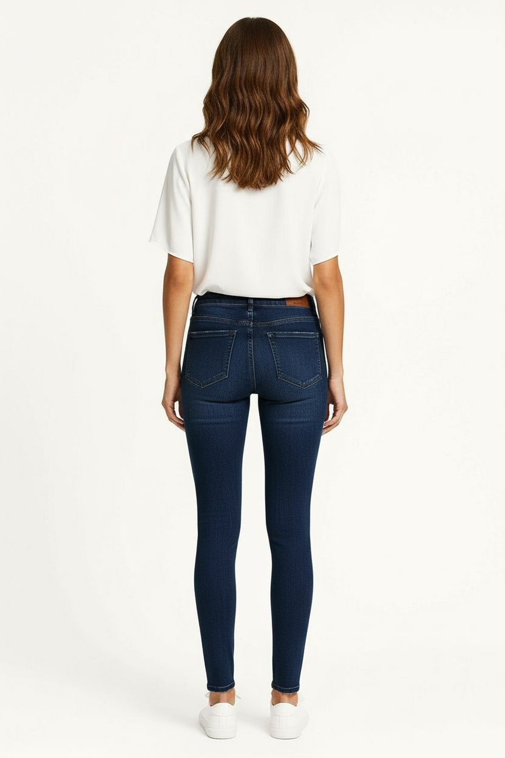 Pantalón skinny de tiro medio con corte ajustado que realza la figura, pretina con doble botón que brinda soporte al abdomen, bolsillos funcionales al frente y en la parte trasera, detalle de estoperoles en la cintura que aporta un toque moderno, confección en mezclilla elástica que ofrece comodidad y libertad de movimiento